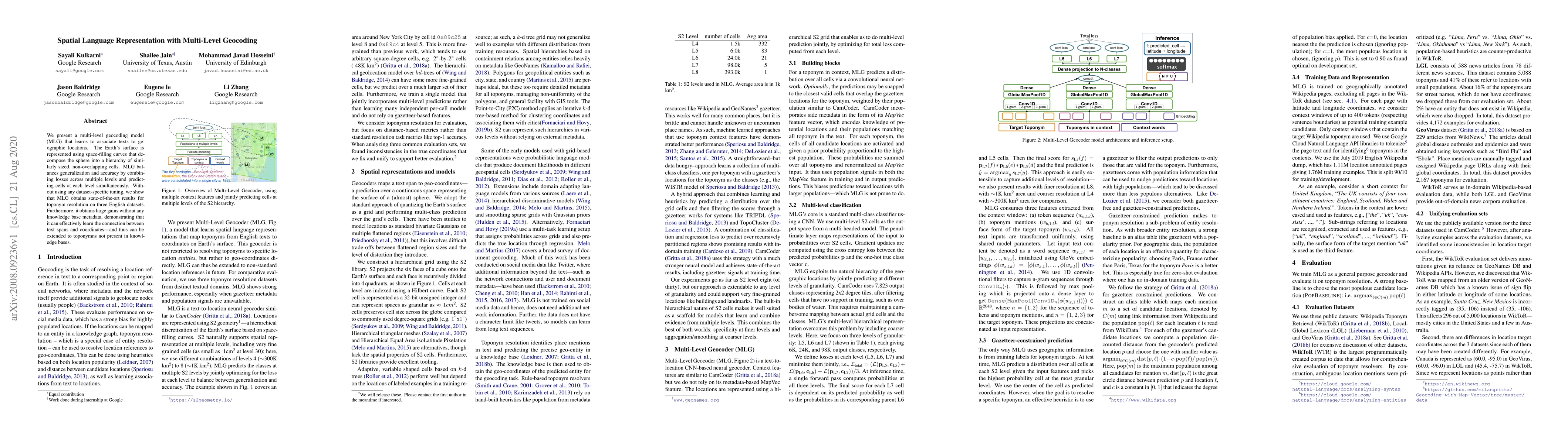 We present a multi-level geocoding model (MLG) that learns to associate texts to geographic locations. The Earth's surface is represented using space-filling curves that decompose the sphere into a hierarchy of similarly sized, non-overlapping cells. MLG balances generalization and accuracy by combining losses across multiple levels and predicting cells at each level simultaneously. Without using any dataset-specific tuning, we show that MLG obtains state-of-the-art results for toponym resolution on three English datasets. Furthermore, it obtains large gains without any knowledge base metadata, demonstrating that it can effectively learn the connection between text spans and coordinates - and thus can be extended to toponymns not present in knowledge bases.