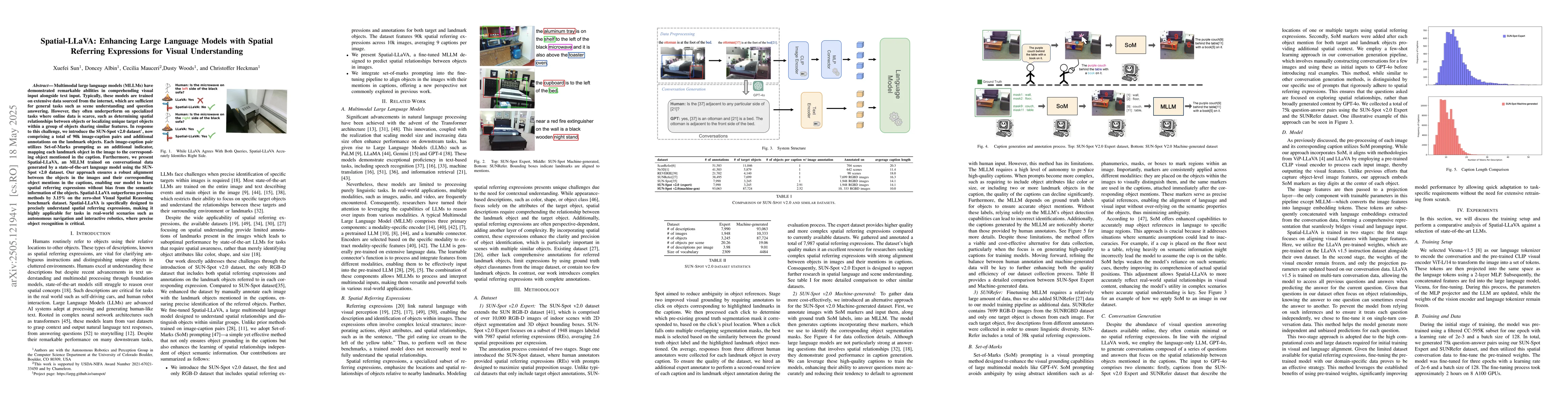 The research introduces the SUN-Spot v2.0 dataset, comprising 90k image-caption pairs with additional annotations on landmark objects, utilizing Set-of-Marks prompting to align objects in images with their mentions in captions. Spatial-LLaVA, an MLLM, is then trained on conversational data generated from this dataset, focusing on spatial referring expressions without semantic bias.