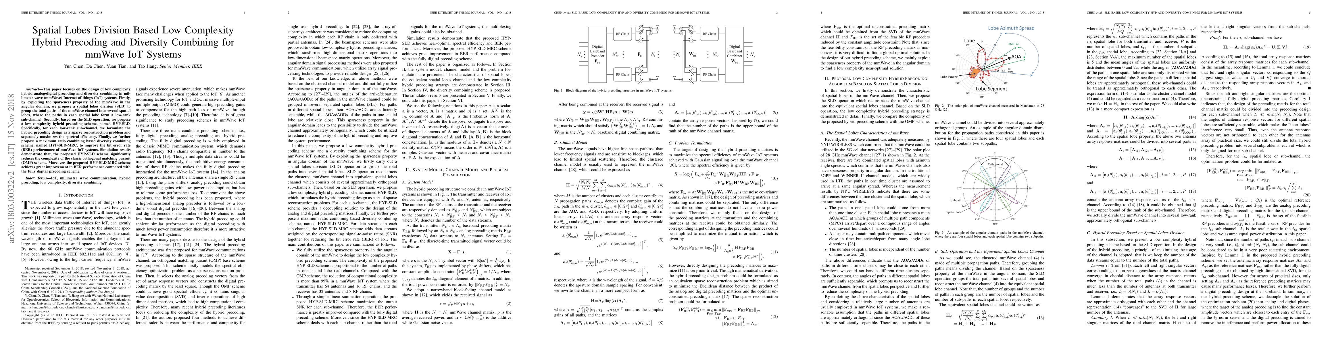 This paper focuses on the design of low complexity hybrid analog/digital precoding and diversity combining in millimeter wave (mmWave) Internet of things (IoT) systems. Firstly, by exploiting the sparseness property of the mmWave in the angular domain, we propose a spatial lobes division (SLD) to group the total paths of the mmWave channel into several spatial lobes, where the paths in each spatial lobe form a low-rank sub-channel. Secondly, based on the SLD operation, we propose a low complexity hybrid precoding scheme, named HYP-SLD. Specifically, for each low-rank sub-channel, we formulate the hybrid precoding design as a sparse reconstruction problem and separately maximizes the spectral efficiency. Finally, we further propose a maximum ratio combining based diversity combining scheme, named HYP-SLD-MRC, to improve the bit error rate (BER) performance of mmWave IoT systems. Simulation results demonstrate that, the proposed HYP-SLD scheme significantly reduces the complexity of the classic orthogonal matching pursuit (OMP) scheme. Moreover, the proposed HYP-SLD-MRC scheme achieves great improvement in BER performance compared with the fully digital precoding scheme.