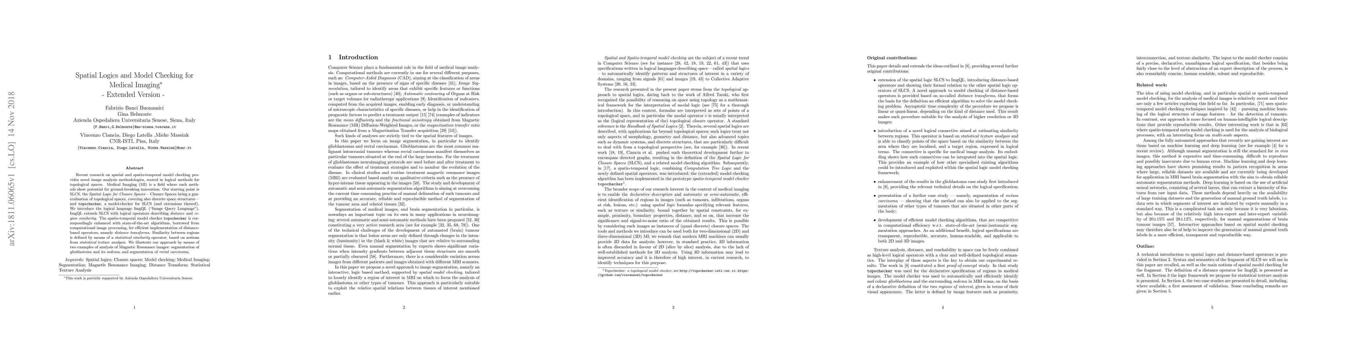 This paper introduces ImgQL, an extension of the Spatial Logic for Closure Spaces (SLCS), to analyze medical imaging using logical methods for topological spaces. The enhanced topochecker model checker incorporates advanced algorithms for distance-based and region similarity analysis, demonstrated through segmentation of glioblastoma and rectal carcinoma in Magnetic Resonance images.