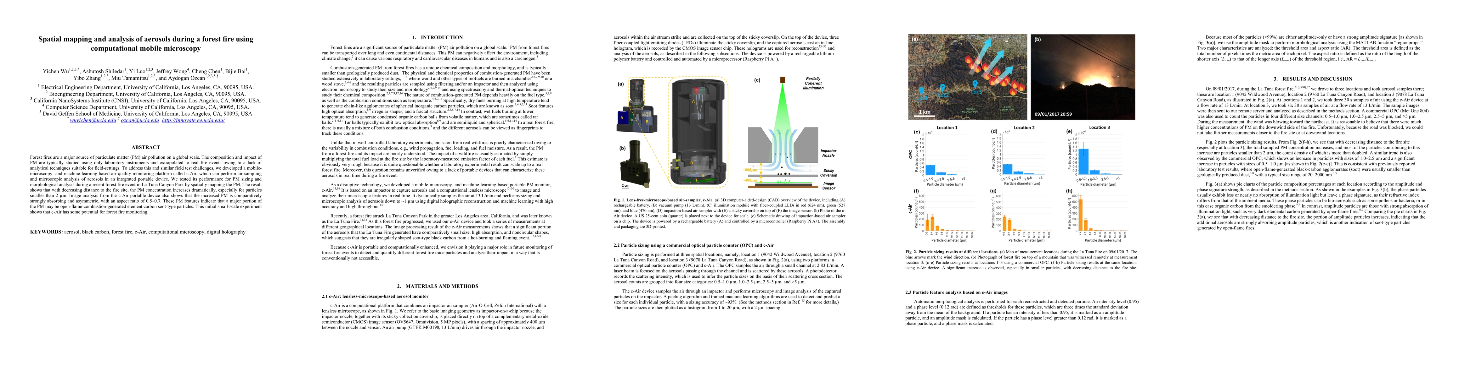 Forest fires are a major source of particulate matter (PM) air pollution on a global scale. The composition and impact of PM are typically studied using only laboratory instruments and extrapolated to real fire events owing to a lack of analytical techniques suitable for field-settings. To address this and similar field test challenges, we developed a mobile-microscopy and machine-learning-based air quality monitoring platform called c-Air, which can perform air sampling and microscopic analysis of aerosols in an integrated portable device. We tested its performance for PM sizing and morphological analysis during a recent forest fire event in La Tuna Canyon Park by spatially mapping the PM. The result shows that with decreasing distance to the fire site, the PM concentration increases dramatically, especially for particles smaller than 2 microns. Image analysis from the c-Air portable device also shows that the increased PM is comparatively strongly absorbing and asymmetric, with an aspect ratio of 0.5-0.7. These PM features indicate that a major portion of the PM may be open-flame-combustion-generated element carbon soot-type particles. This initial small-scale experiment shows that c-Air has some potential for forest fire monitoring.