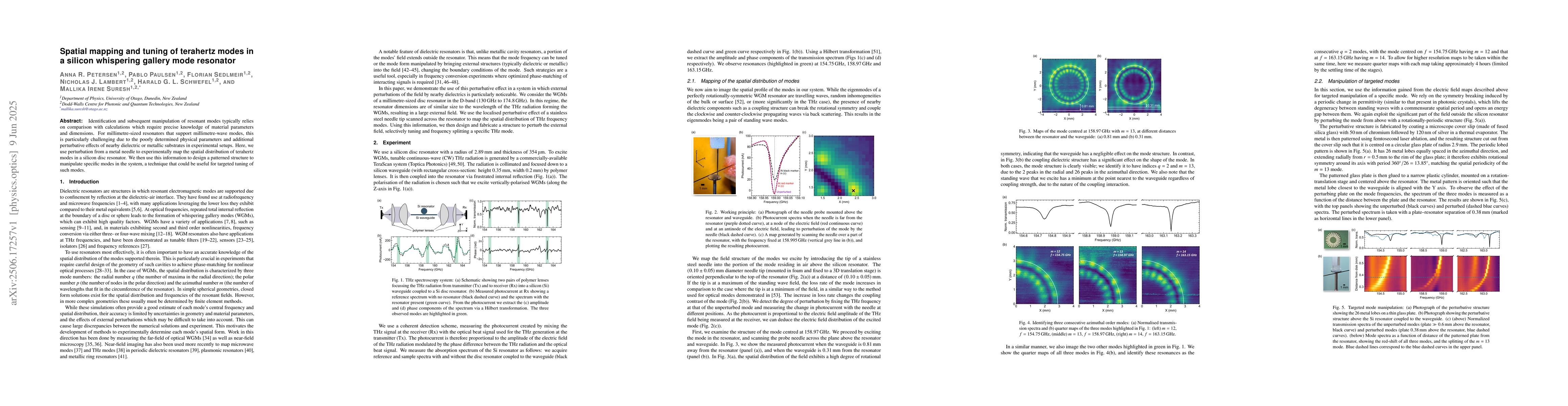 Identification and subsequent manipulation of resonant modes typically relies on comparison with calculations which require precise knowledge of material parameters and dimensions. For millimetre-sized resonators that support millimetre-wave modes, this is particularly challenging due to the poorly determined physical parameters and additional perturbative effects of nearby dielectric or metallic substrates in experimental setups. Here, we use perturbation from a metal needle to experimentally map the spatial distribution of terahertz modes in a silicon disc resonator. We then use this information to design a patterned structure to manipulate specific modes in the system, a technique that could be useful for targeted tuning of such modes.