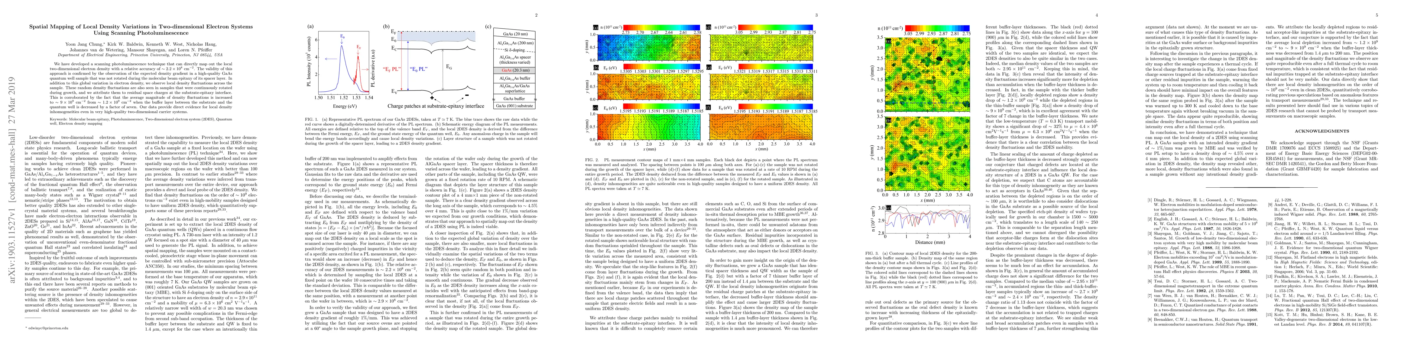 We have developed a scanning photoluminescence technique that can directly map out the local two-dimensional electron density with a relative accuracy of $\sim2.2\times10^8$ cm$^{-2}$. The validity of this approach is confirmed by the observation of the expected density gradient in a high-quality GaAs quantum well sample that was not rotated during the molecular beam epitaxy of its spacer layer. In addition to this global variation in electron density, we observe local density fluctuations across the sample. These random density fluctuations are also seen in samples that were continuously rotated during growth, and we attribute them to residual space charges at the substrate-epitaxy interface. This is corroborated by the fact that the average magnitude of density fluctuations is increased to $\sim9\times10^{9}$ cm$^{-2}$ from $\sim1.2\times10^9$ cm$^{-2}$ when the buffer layer between the substrate and the quantum well is decreased by a factor of seven. Our data provide direct evidence for local density inhomogeneities even in very high-quality two-dimensional carrier systems.