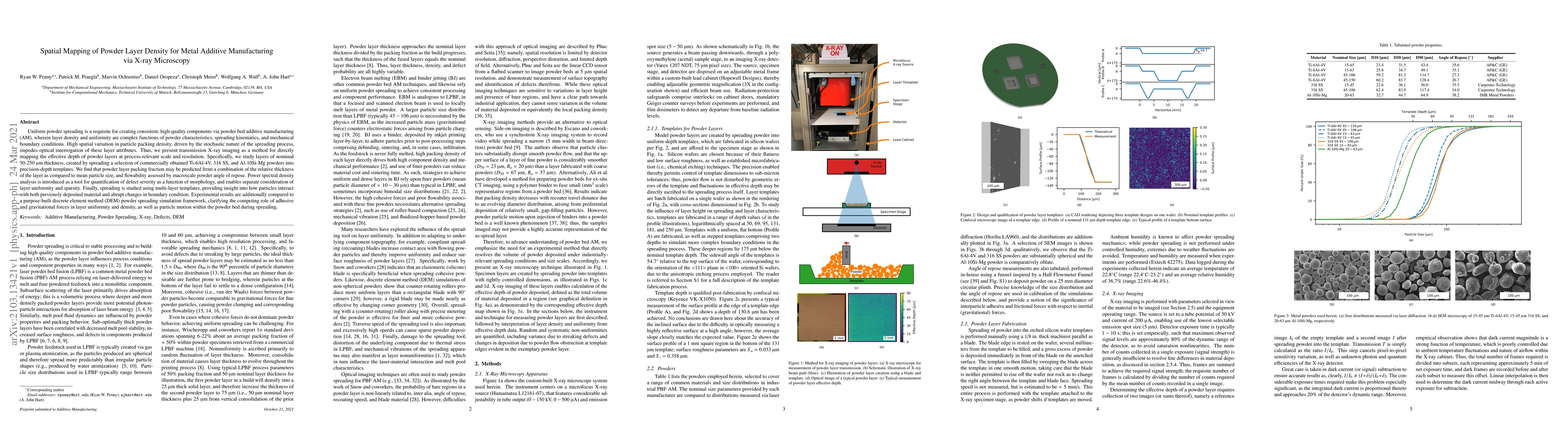 Uniform powder spreading is a requisite for creating consistent, high-quality components via powder bed additive manufacturing (AM), wherein layer density and uniformity are complex functions of powder characteristics, spreading kinematics, and mechanical boundary conditions. High spatial variation in particle packing density, driven by the stochastic nature of the spreading process, impedes optical interrogation of these layer attributes. Thus, we present transmission X-ray imaging as a method for directly mapping the effective depth of powder layers at process-relevant scale and resolution. Specifically, we study layers of nominal 50-250 micrometer thickness, created by spreading a selection of commercially obtained Ti-6Al-4V, 316 SS, and Al-10Si-Mg powders into precision-depth templates. We find that powder layer packing fraction may be predicted from a combination of the relative thickness of the layer as compared to mean particle size, and flowability assessed by macroscale powder angle of repose. Power spectral density analysis is introduced as a tool for quantification of defect severity as a function of morphology, and enables separate consideration of layer uniformity and sparsity. Finally, spreading is studied using multi-layer templates, providing insight into how particles interact with both previously deposited material and abrupt changes in boundary condition. Experimental results are additionally compared to a purpose-built discrete element method (DEM) powder spreading simulation framework, clarifying the competing role of adhesive and gravitational forces in layer uniformity and density, as well as particle motion within the powder bed during spreading.
