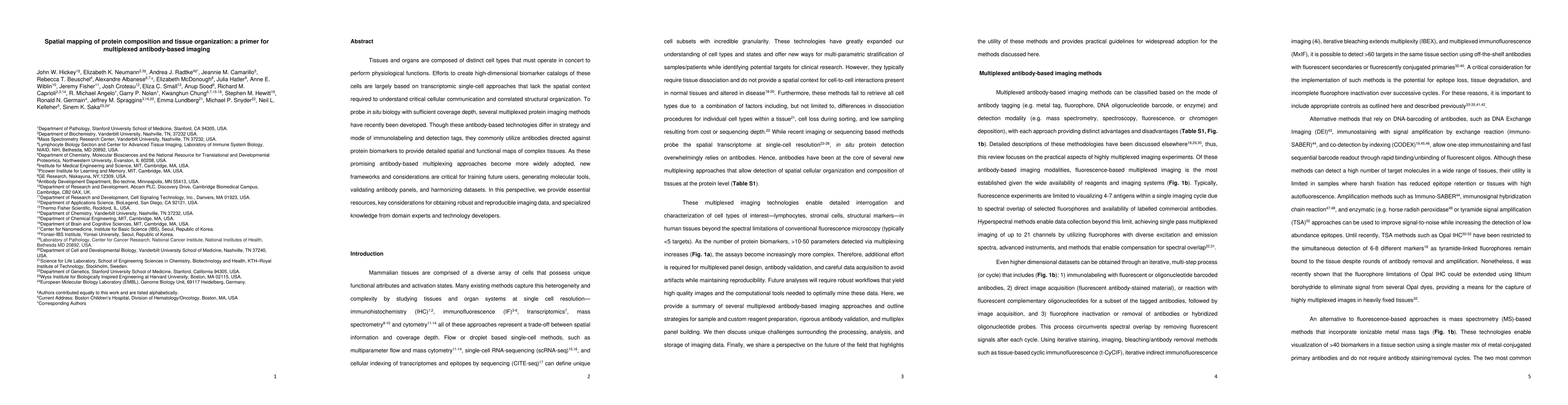 This paper outlines the development and application of multiplexed antibody-based imaging techniques for mapping protein composition and tissue organization, emphasizing the need for spatial context in understanding cellular interactions. It provides essential resources and considerations for generating reproducible data, highlighting the importance of antibody validation and dataset harmonization.