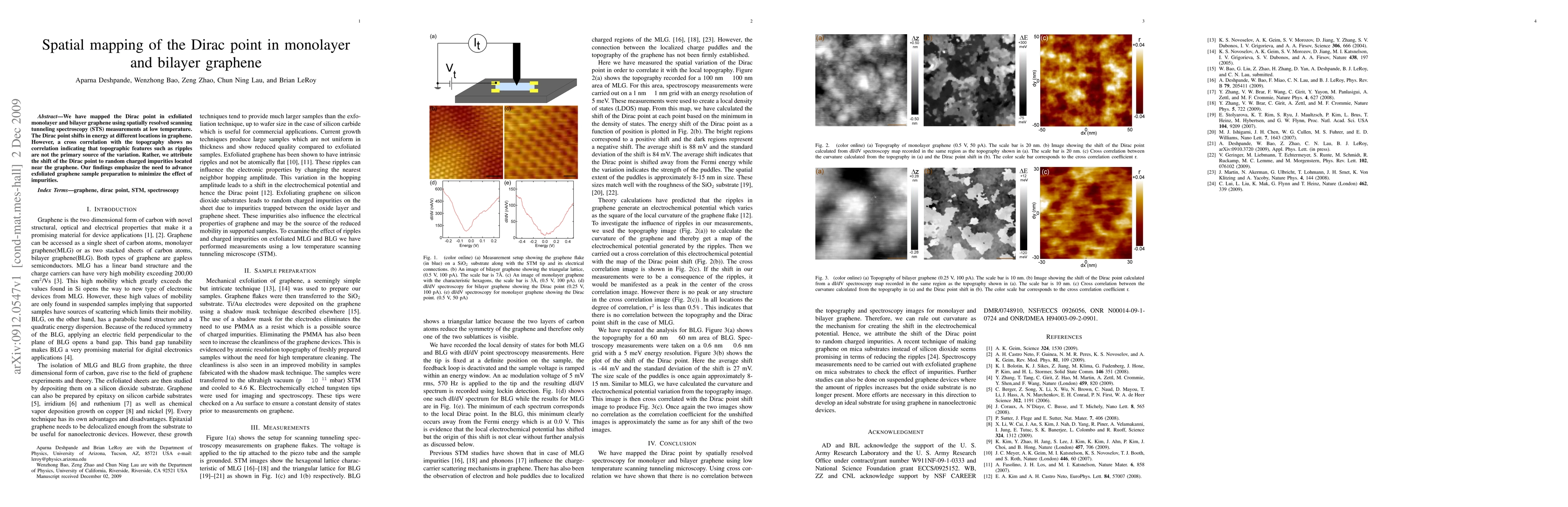 This study uses scanning tunneling spectroscopy to map the Dirac point in monolayer and bilayer graphene, finding that its energy shift is due to random charged impurities rather than topographical features. The research highlights the necessity of improved sample preparation to reduce impurity effects.