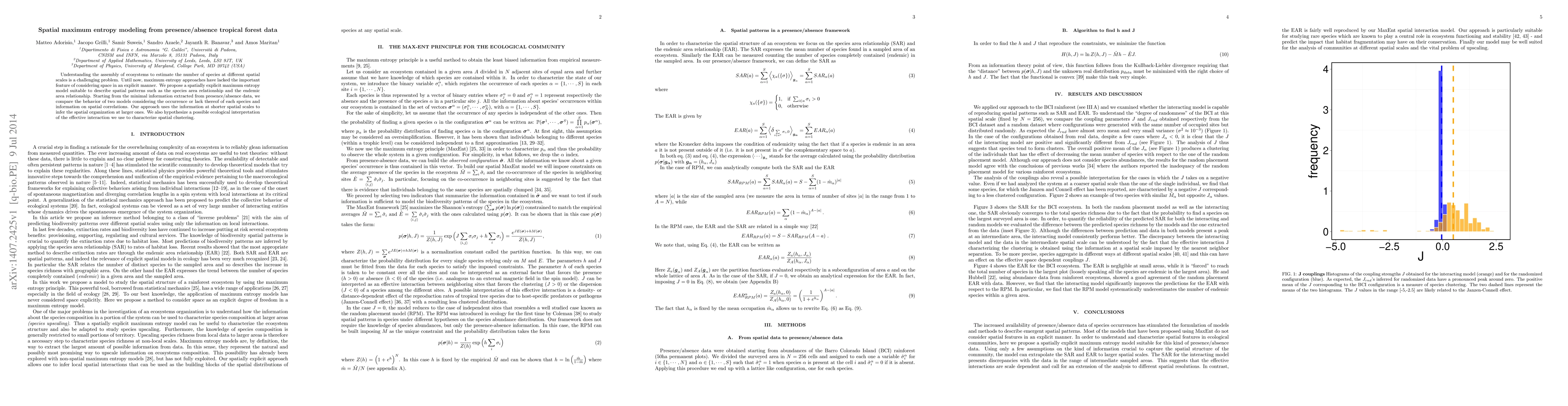 This paper introduces a spatially explicit maximum entropy model to understand tropical forest ecosystems, addressing the species area relationship and endemic area relationship. The proposed model infers spatial organization from presence/absence data and considers spatial correlations, offering a novel approach to ecological modeling.