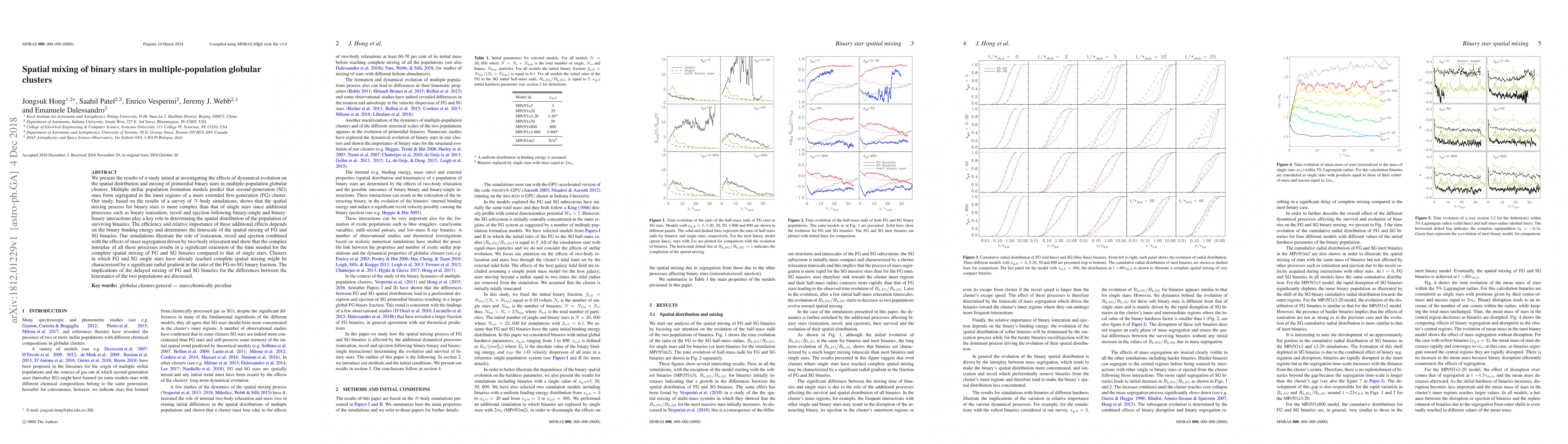 We present the results of a study aimed at investigating the effects of dynamical evolution on the spatial distribution and mixing of primordial binary stars in multiple-population globular clusters. Multiple stellar population formation models predict that second-generation (SG) stars form segregated in the inner regions of a more extended first-generation (FG) cluster. Our study, based on the results of a survey of N-body simulations, shows that the spatial mixing process for binary stars is more complex than that of single stars since additional processes such as binary ionization, recoil and ejection following binary-single and binary-binary interactions play a key role in determining the spatial distribution of the population of surviving binaries. The efficiency and relative importance of these additional effects depends on the binary binding energy and determines the timescale of the spatial mixing of FG and SG binaries. Our simulations illustrate the role of ionization, recoil and ejection combined with the effects of mass segregation driven by two-body relaxation and show that the complex interplay of all these processes results in a significant extension of the time needed for the complete spatial mixing of FG and SG binaries compared to that of single stars. Clusters in which FG and SG single stars have already reached complete spatial mixing might be characterized by a significant radial gradient in the ratio of the FG-to-SG binary fraction. The implications of the delayed mixing of FG and SG binaries for the differences between the kinematics of the two populations are discussed.