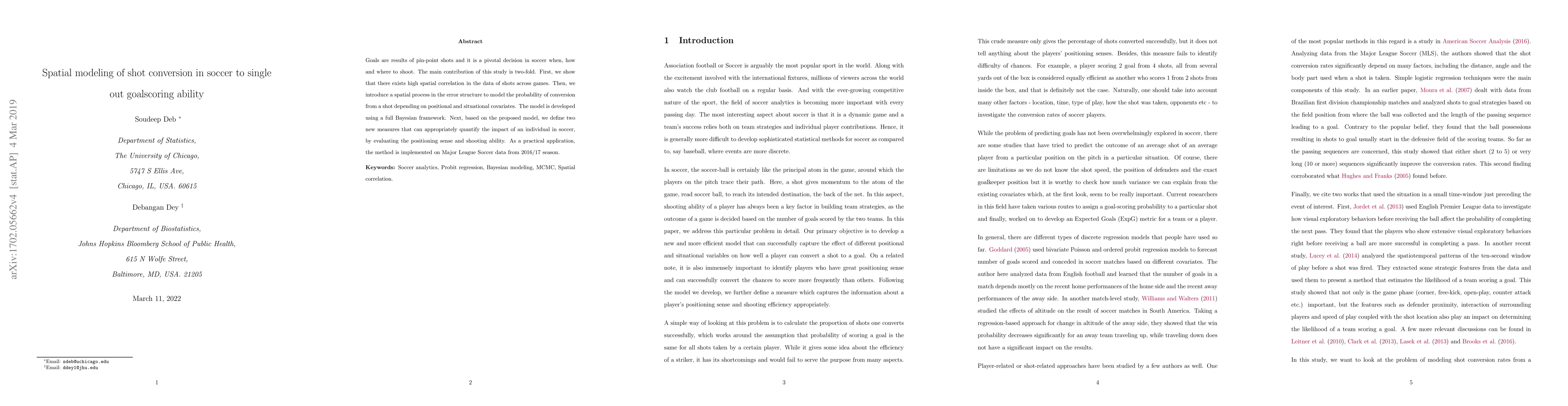 This study introduces a spatial model using a Bayesian framework to predict shot conversion probability in soccer, considering positional and situational factors. It also proposes new measures to evaluate players' positioning sense and shooting abilities, applied to MLS 2016/17 season data.