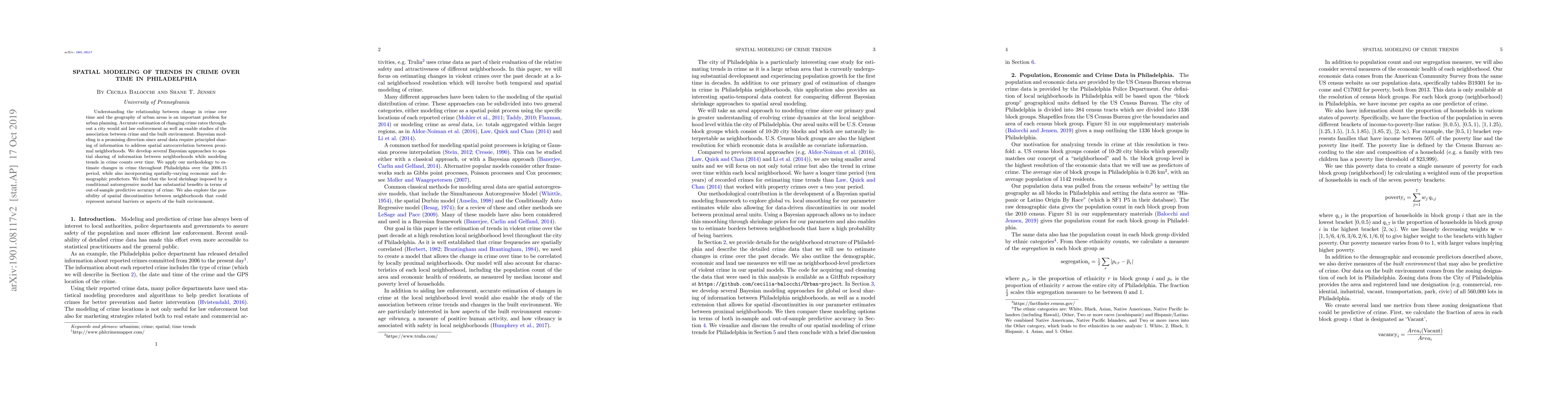 This paper develops Bayesian spatial models to estimate trends in crime over time in Philadelphia, focusing on the spatial autocorrelation in crime data. The study finds that conditional autoregressive models provide better predictive accuracy and explores spatial discontinuities that may indicate natural barriers or built environment features.