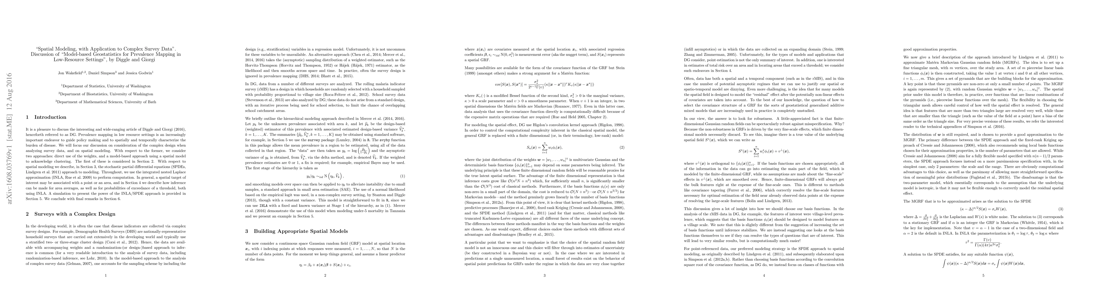 This paper discusses spatial modeling techniques for prevalence mapping in low-resource settings, emphasizing the importance of considering complex survey designs. It explores both direct weight-based methods and model-based approaches using spatial models to account for clustering, with a focus on Gaussian random field models.