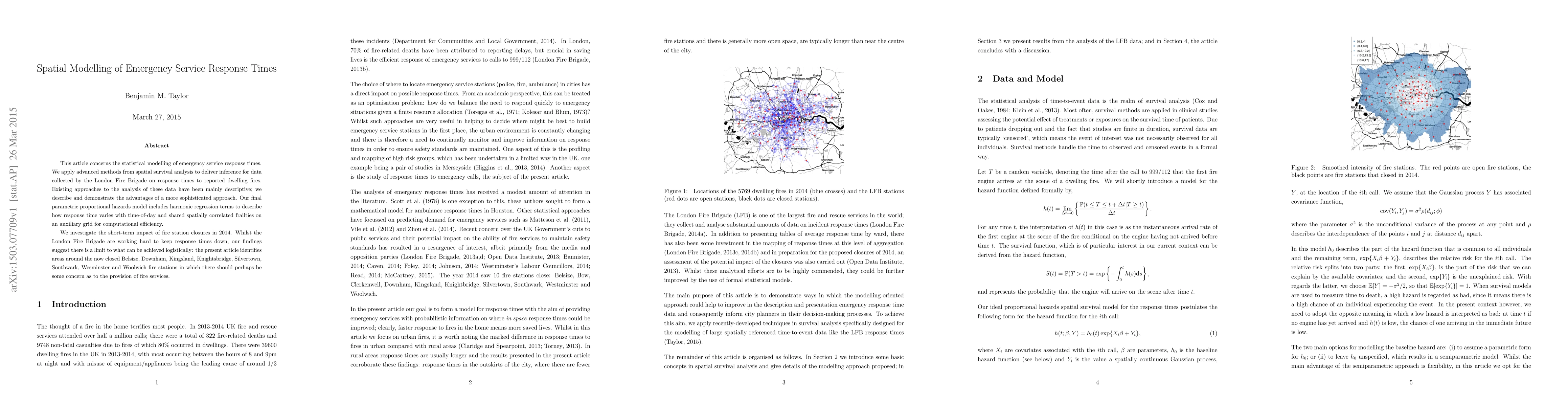 This article concerns the statistical modelling of emergency service response times. We apply advanced methods from spatial survival analysis to deliver inference for data collected by the London Fire Brigade on response times to reported dwelling fires. Existing approaches to the analysis of these data have been mainly descriptive; we describe and demonstrate the advantages of a more sophisticated approach. Our final parametric proportional hazards model includes harmonic regression terms to describe how response time varies with time-of-day and shared spatially correlated frailties on an auxiliary grid for computational efficiency. We investigate the short-term impact of fire station closures in 2014. Whilst the London Fire Brigade are working hard to keep response times down, our findings suggest there is a limit to what can be achieved logistically: the present article identifies areas around the now closed Belsize, Downham, Kingsland, Knightsbridge, Silvertown, Southwark, Wesminster and Woolwich fire stations in which there should perhaps be some concern as to the provision of fire services.