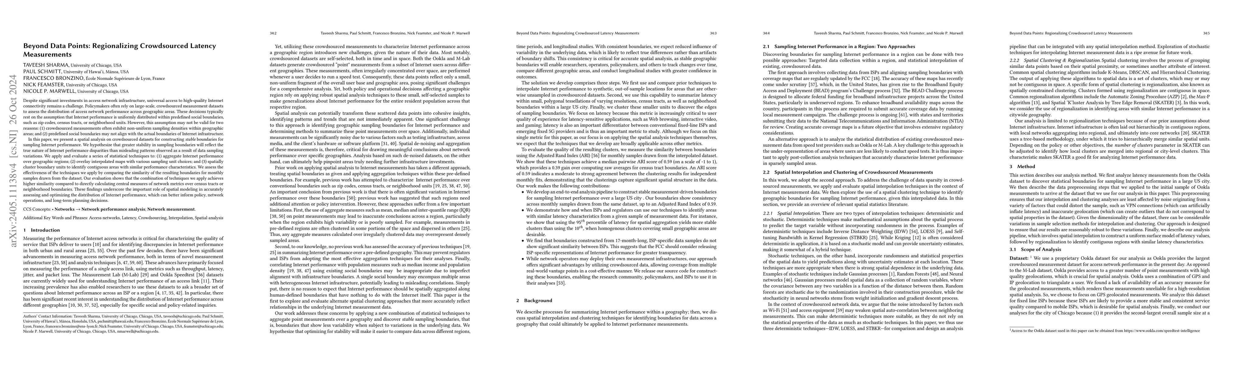 Despite significant investments in access network infrastructure, universal access to high-quality Internet connectivity remains a challenge. Policymakers often rely on large-scale, crowdsourced measurement datasets to assess the distribution of access network performance across geographic areas. These decisions typically rest on the assumption that Internet performance is uniformly distributed within predefined social boundaries, such as zip codes, census tracts, or community areas. However, this assumption may not be valid for two reasons: (1) crowdsourced measurements often exhibit non-uniform sampling densities within geographic areas; and (2) predefined social boundaries may not align with the actual boundaries of Internet infrastructure. In this paper, we model Internet performance as a spatial process. We apply and evaluate a series of statistical techniques to: (1) aggregate Internet performance over a geographic region; (2) overlay interpolated maps with various sampling boundary choices; and (3) spatially cluster boundary units to identify areas with similar performance characteristics. We evaluated the effectiveness of these using a 17-month-long crowdsourced dataset from Ookla Speedtest. We evaluate several leading interpolation methods at varying spatial scales. Further, we examine the similarity between the resulting boundaries for smaller realizations of the dataset. Our findings suggest that our combination of techniques achieves a 56% gain in similarity score over traditional methods that rely on aggregates over raw measurement values for performance summarization. Our work highlights an urgent need for more sophisticated strategies in understanding and addressing Internet access disparities.