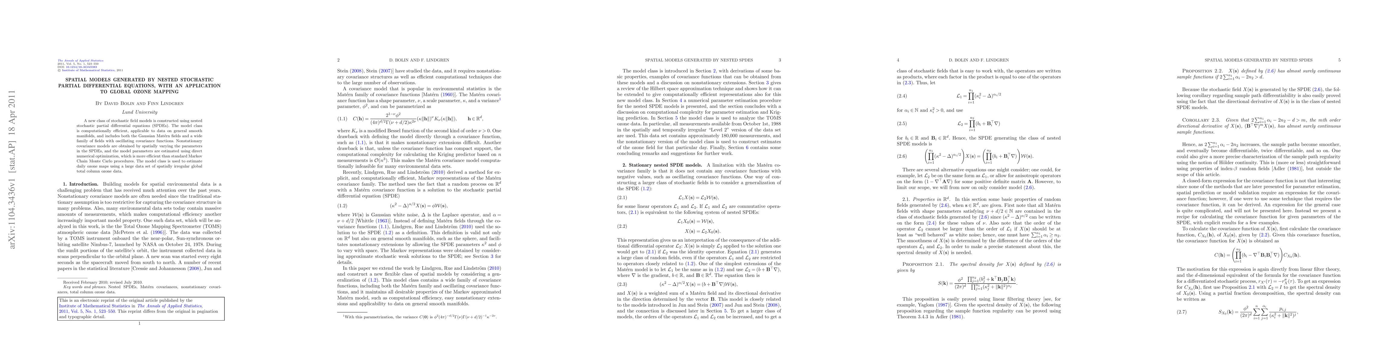 This paper introduces a new class of efficient stochastic field models based on nested stochastic partial differential equations for spatial data analysis, including nonstationary covariance models. The method is applied to generate daily ozone maps from global total column ozone data, demonstrating computational efficiency over traditional methods.