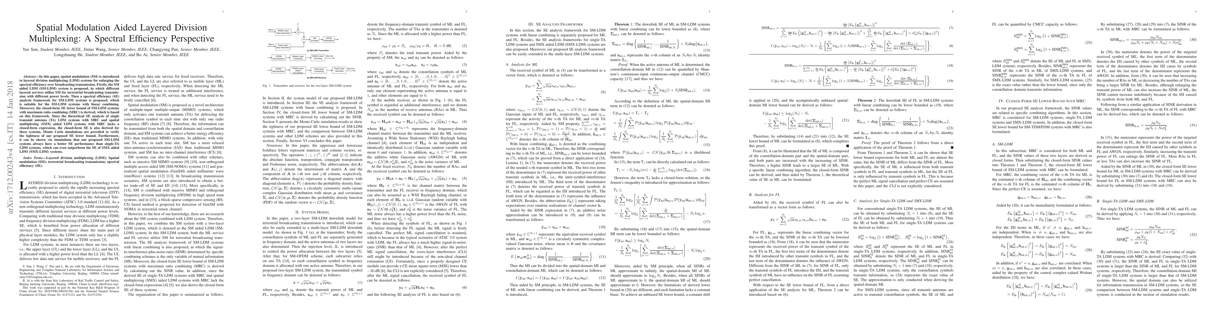 In this paper, spatial modulation (SM) is introduced to layered division multiplexing (LDM) systems for enlarging the spectral efficiency over broadcasting transmission. Firstly, the SM aided LDM (SM-LDM) system is proposed, in which different layered services utilize SM for terrestrial broadcasting transmission with different power levels. Then a spectral efficiency (SE) analysis framework for SM-LDM systems is proposed, which is suitable for the SM-LDM systems with linear combining. Moreover, the closed-form SE lower bound of SM-LDM systems with maximum ratio combining (MRC) is derived, which is based on this framework. Since the theoretical SE analysis of single transmit antenna (TA) LDM systems with MRC and spatial multiplexing (SMX) aided LDM systems with MRC lacks a closed-form expression, the closed-form SE is also derived for these systems. Monte Carlo simulations are provided to verify the tightness of our proposed SE lower bound. Furthermore, it can be shown via simulations that our proposed SM-LDM systems always have a better SE performance than single-TA LDM systems, which can even outperform the SE of SMX aided LDM (SMX-LDM) systems.