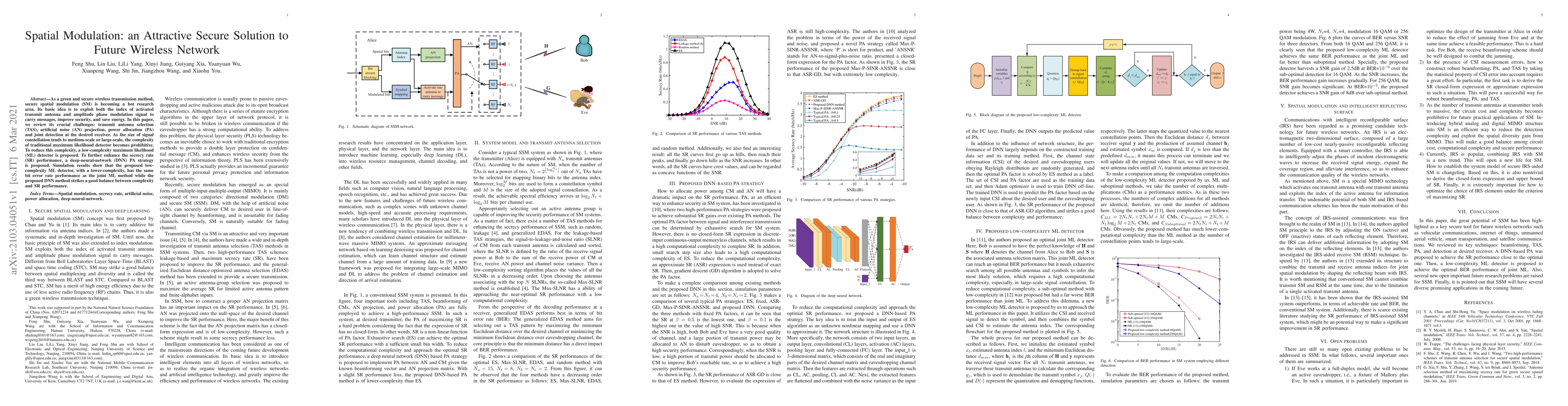 Secure spatial modulation offers a promising solution for future wireless networks, with proposed methods improving security and performance without increasing complexity. Simulation results show that the new detection and power allocation strategies can achieve similar or better performance than traditional methods.