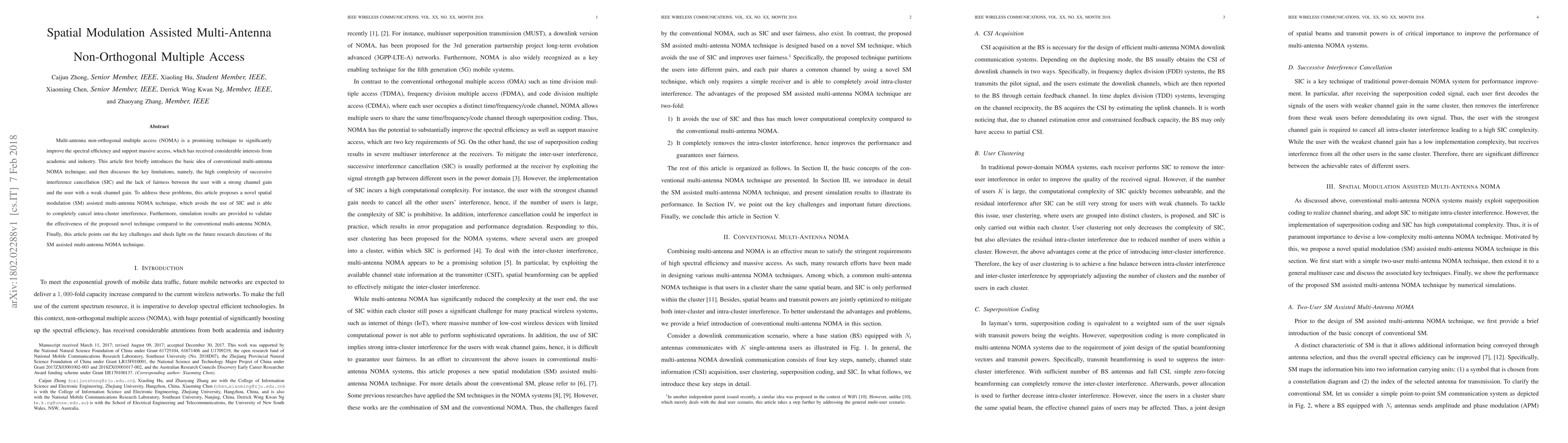 This paper proposes a spatial modulation (SM) assisted multi-antenna non-orthogonal multiple access (NOMA) technique to address the high complexity of successive interference cancellation (SIC) and fairness issues. The novel approach eliminates SIC and fully cancels intra-cluster interference, validated by simulation results.