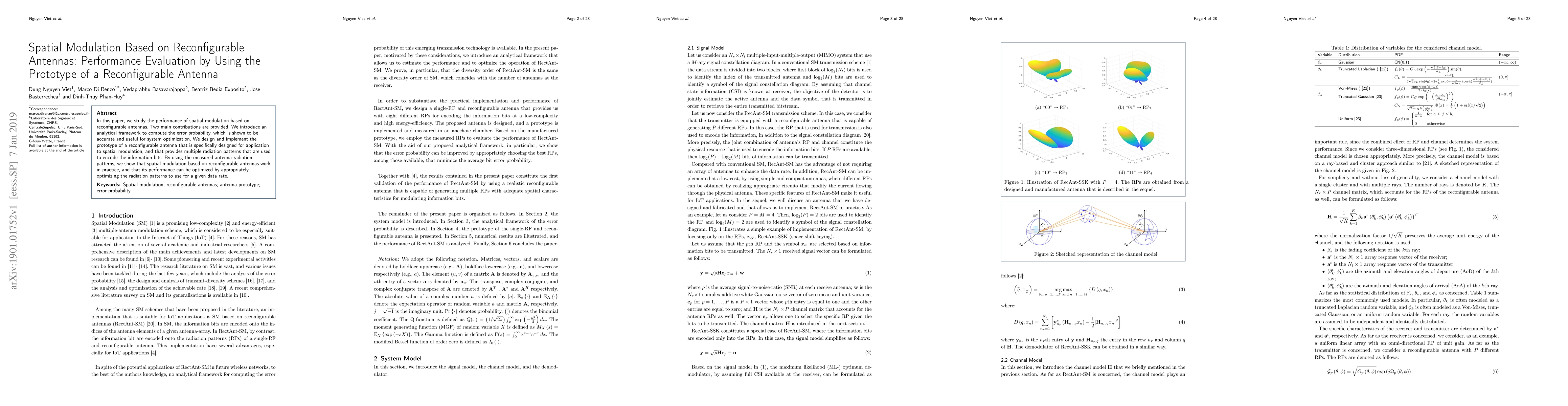 The paper introduces an analytical framework for computing the error probability of spatial modulation based on reconfigurable antennas and designs a prototype antenna specifically for this application.