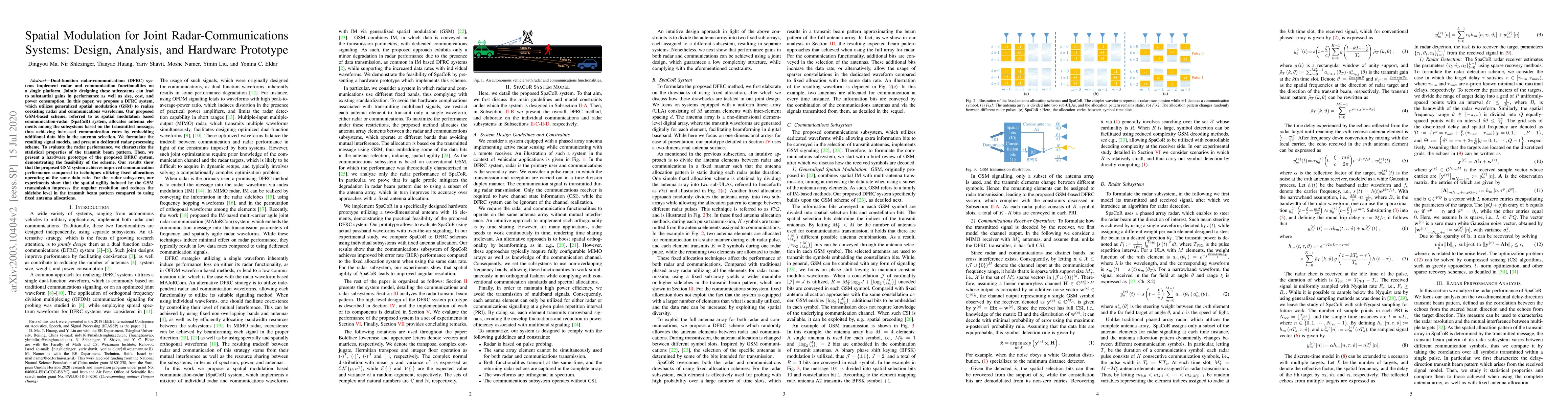 This paper proposes a dual-function radar-communications system utilizing generalized spatial modulation to enhance both communication rates and radar performance. The SpaCoR system dynamically allocates antenna elements based on transmitted messages, achieving improved communication and radar resolution, as demonstrated by a hardware prototype.