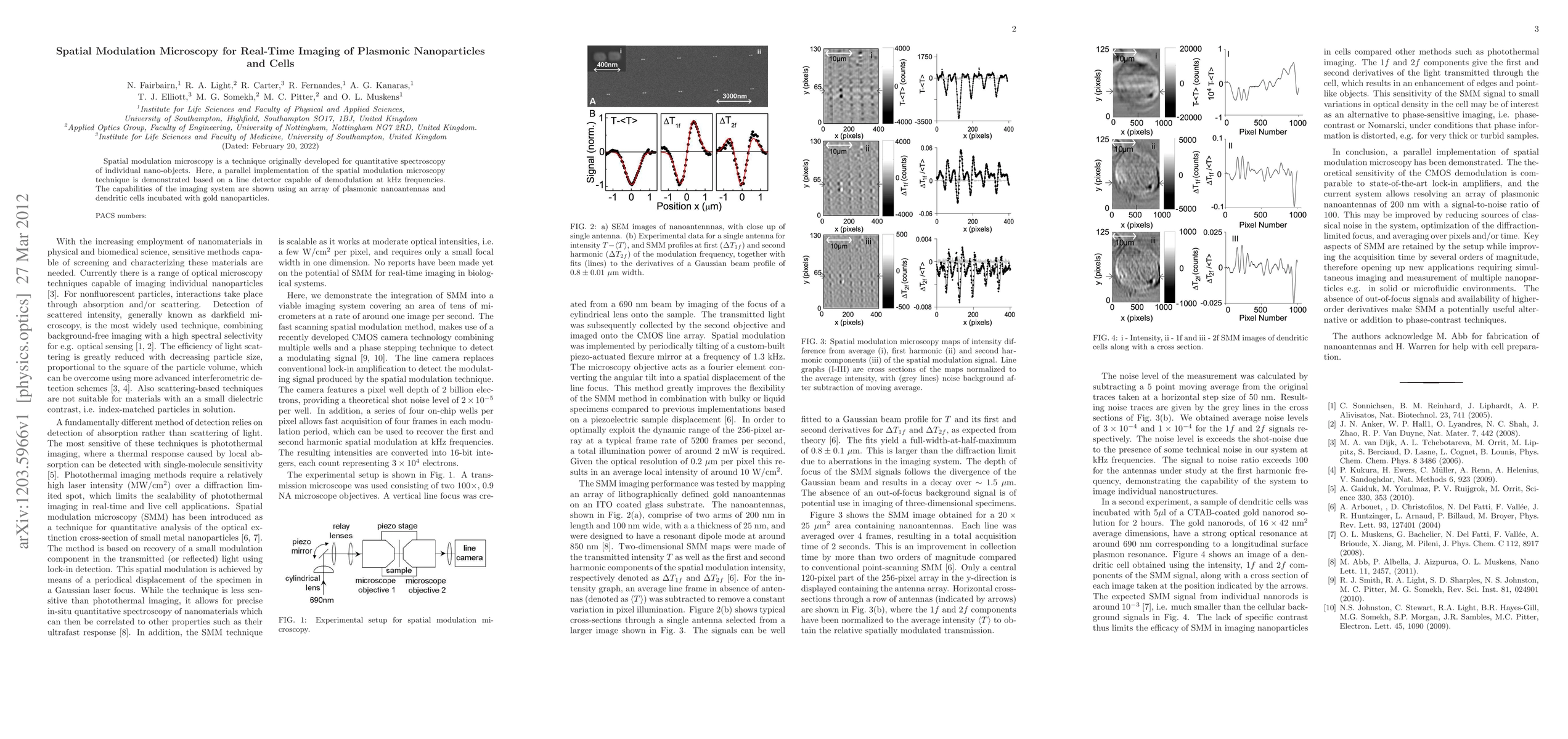 Spatial modulation microscopy enables real-time imaging of plasmonic nanoparticles and cells using a line detector for kHz frequency demodulation. The technique's effectiveness is demonstrated through imaging of plasmonic nanoantennas and gold nanoparticles in dendritic cells.