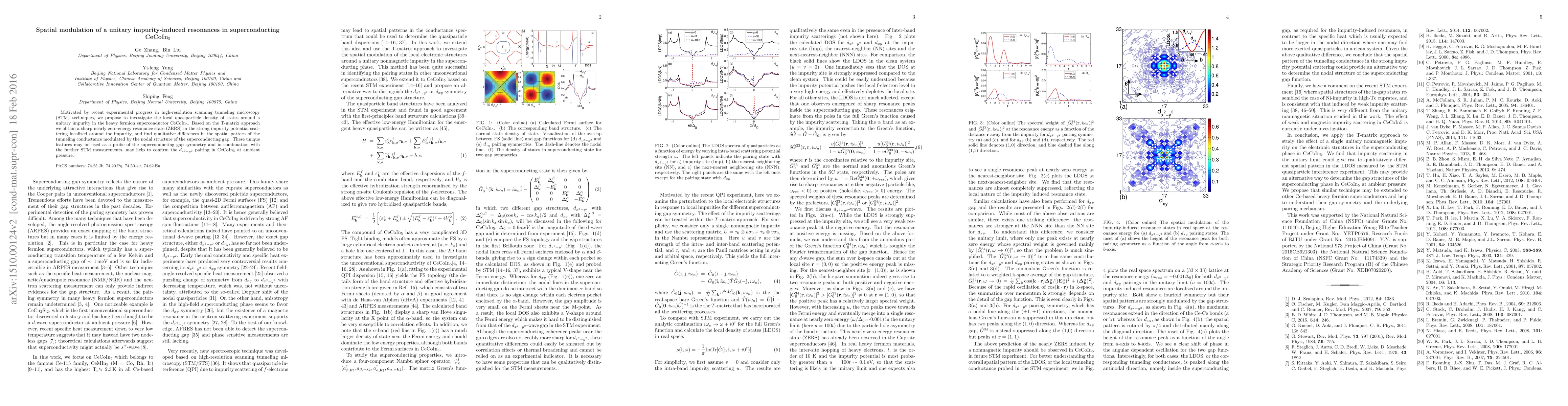 This paper investigates the local quasiparticle density of states around a unitary impurity in the superconductor CeCoIn$_{5}$ using the T-matrix approach. It reveals a sharp zero-energy resonance state and distinct spatial modulation of tunneling conductance influenced by the superconducting gap's nodal structure, potentially confirming $d_{x^{2}-y^{2}}$ pairing symmetry.
