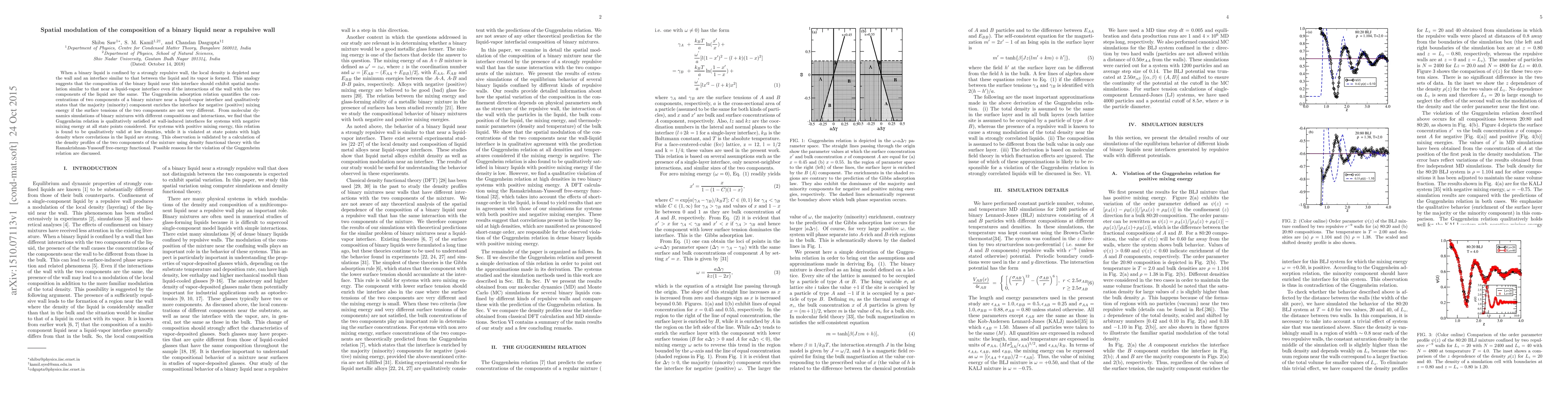 When a binary liquid is confined by a strongly repulsive wall, the local density is depleted near the wall and an interface similar to that between the liquid and its vapor is formed. This analogy suggests that the composition of the binary liquid near this interface should exhibit spatial modulation similar to that near a liquid-vapor interface even if the interactions of the wall with the two components of the liquid are the same. The Guggenheim adsorption relation quantifies the concentrations of two components of a binary mixture near a liquid-vapor interface and qualitatively states that the majority (minority) component enriches the interface for negative (positive) mixing energy if the surface tensions of the two components are not very different. From molecular dynamics simulations of binary mixtures with different compositions and interactions, we find that the Guggenheim relation is qualitatively satisfied at wall-induced interfaces for systems with negative mixing energy at all state points considered. For systems with positive mixing energy, this relation is found to be qualitatively valid at low densities, while it is violated at state points with high density where correlations in the liquid are strong. This observation is validated by a calculation of the density profiles of the two components of the mixture using density functional theory with the Ramakrishnan-Yussouff free-energy functional. Possible reasons for the violation of the Guggenheim relation are discussed.