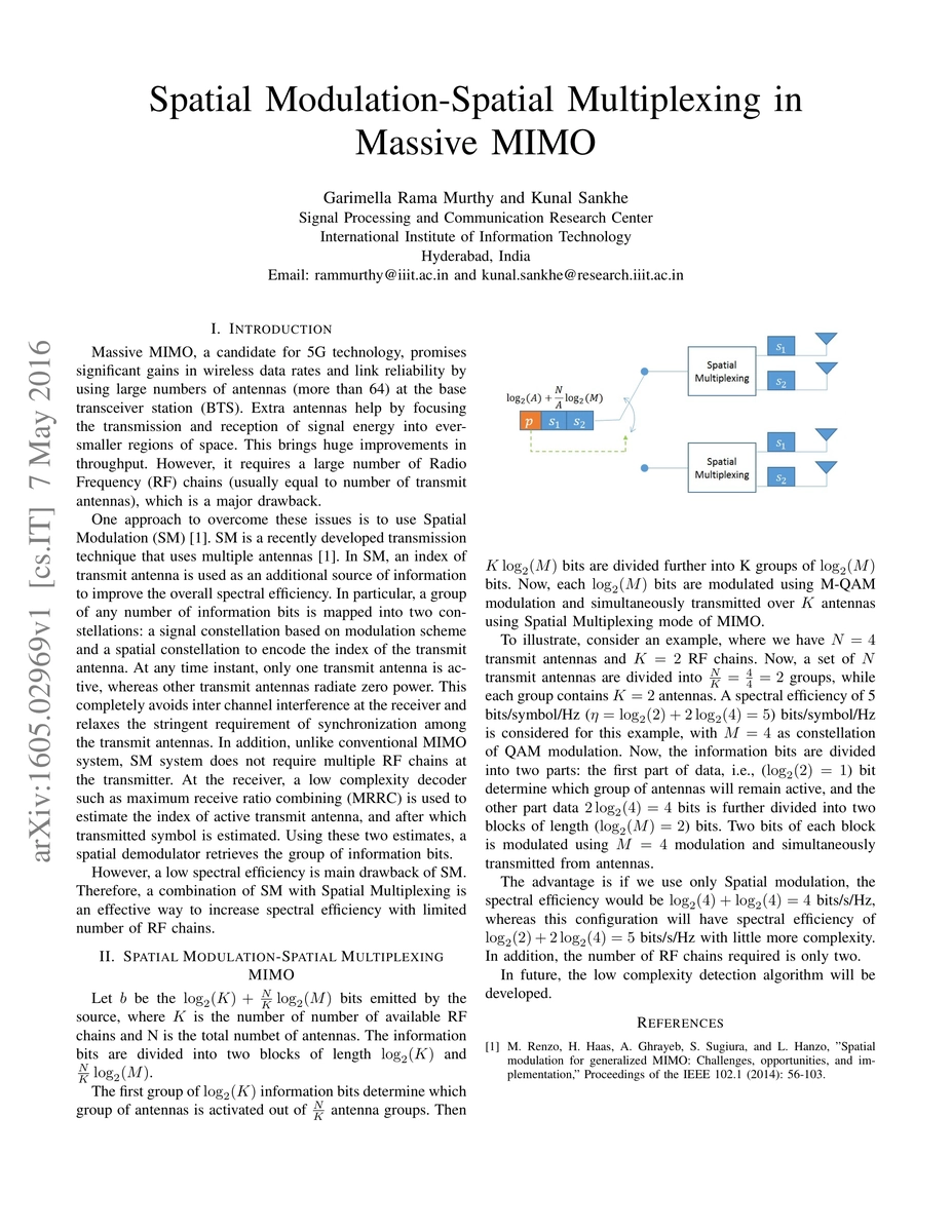 Massive MIMO, a candidate for 5G technology, promises significant gains in wireless data rates and link reliability by using large numbers of antennas (more than 64) at the base transceiver station (BTS). Extra antennas help by focusing the transmission and reception of signal energy into ever-smaller regions of space. This brings huge improvements in throughput. However, it requires a large number of Radio Frequency (RF) chains (usually equal to number of transmit antennas), which is a major drawback. One approach to overcome these issues is to use Spatial Modulation (SM). In SM, an index of transmit antenna is used as an additional source of information to improve the overall spectral efficiency. In particular, a group of any number of information bits is mapped into two constellations: a signal constellation based on modulation scheme and a spatial constellation to encode the index of the transmit antenna. However, a low spectral efficiency is main drawback of SM. Therefore, a combination of SM with Spatial Multiplexing is an effective way to increase spectral efficiency with limited number of RF chains.