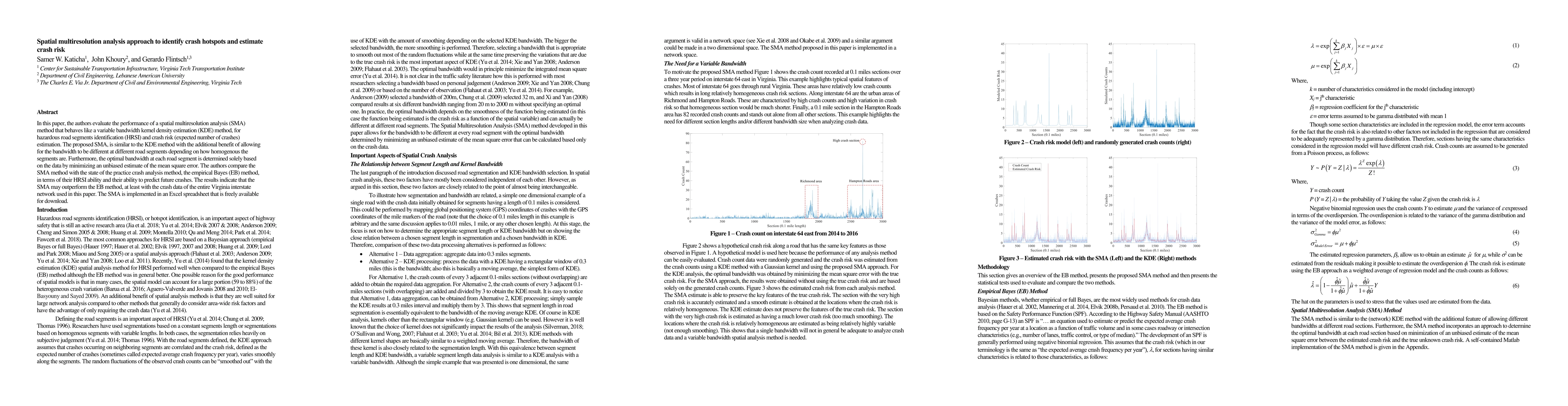 In this paper, the authors evaluate the performance of a spatial multiresolution analysis (SMA) method that behaves like a variable bandwidth kernel density estimation (KDE) method, for hazardous road segments identification (HRSI) and crash risk (expected number of crashes) estimation. The proposed SMA, is similar to the KDE method with the additional benefit of allowing for the bandwidth to be different at different road segments depending on how homogenous the segments are. Furthermore, the optimal bandwidth at each road segment is determined solely based on the data by minimizing an unbiased estimate of the mean square error. The authors compare the SMA method with the state of the practice crash analysis method, the empirical Bayes (EB) method, in terms of their HRSI ability and their ability to predict future crashes. The results indicate that the SMA may outperform the EB method, at least with the crash data of the entire Virginia interstate network used in this paper. The SMA is implemented in an Excel spreadsheet that is freely available for download.