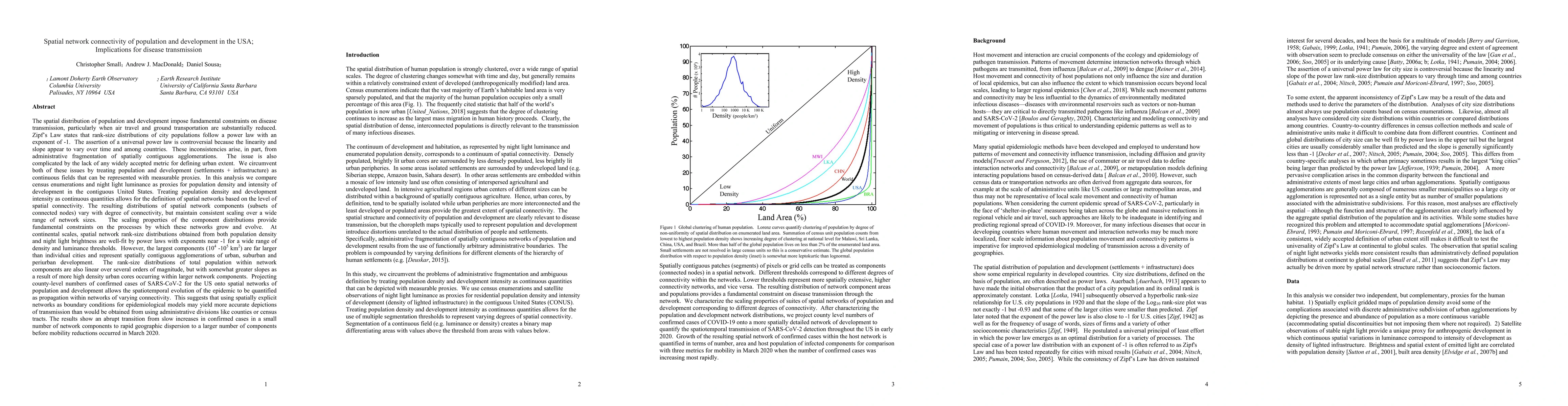 Zipfs Law states that rank-size distributions of city populations follow a power law with an exponent of -1. The assertion of a universal power law is controversial because the linearity and slope appear to vary over time and among countries. We compare census enumerations and night light luminance as proxies for population density and intensity of development in the contiguous United States. Treating population density and development intensity as continuous quantities allows for the definition of spatial networks based on the level of spatial connectivity. The resulting distributions of spatial network components (subsets of connected nodes) vary with degree of connectivity, but maintain consistent scaling over a wide range of network sizes. At continental scales, spatial network rank-size distributions obtained from both population density and night light brightness are well-fit by power laws with exponents near -1 for a wide range of density and luminance thresholds. However, the largest components (10,000 - 100,000 sq.km) are far larger than individual cities and represent spatially contiguous agglomerations of urban, suburban and periurban development. Projecting county-level numbers of confirmed cases of SARS-CoV-2 for the US onto spatial networks of population and development allows the spatiotemporal evolution of the epidemic to be quantified as propagation within networks of varying connectivity.. The results show an abrupt transition from slow increases in confirmed cases in a small number of network components to rapid geographic dispersion to a larger number of components before mobility reductions occurred in March 2020.