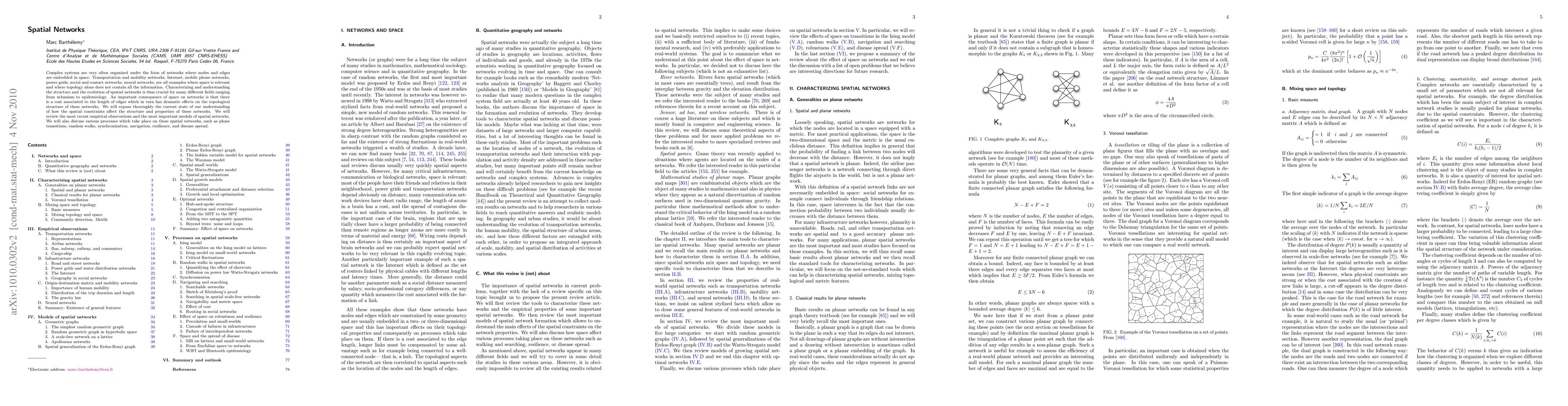 This paper explores the impact of spatial constraints on the structure and properties of networks, such as transportation and social networks, emphasizing the costs associated with edge lengths and their effects on topology. It reviews recent empirical observations and models of spatial networks, and discusses processes like phase transitions, random walks, and disease spread occurring on these networks.