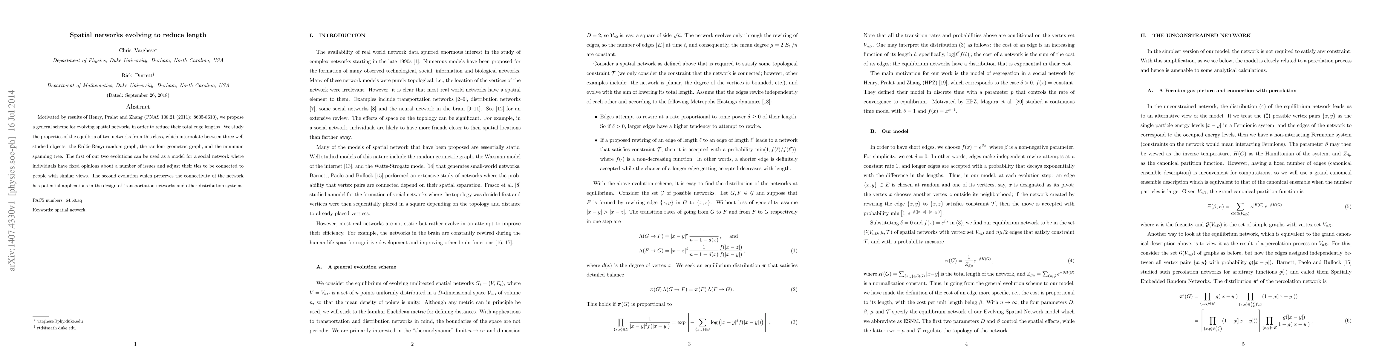 Motivated by results of Henry, Pralat and Zhang (PNAS 108.21 (2011): 8605-8610), we propose a general scheme for evolving spatial networks in order to reduce their total edge lengths. We study the properties of the equilbria of two networks from this class, which interpolate between three well studied objects: the Erd\H{o}s-R\'{e}nyi random graph, the random geometric graph, and the minimum spanning tree. The first of our two evolutions can be used as a model for a social network where individuals have fixed opinions about a number of issues and adjust their ties to be connected to people with similar views. The second evolution which preserves the connectivity of the network has potential applications in the design of transportation networks and other distribution systems.