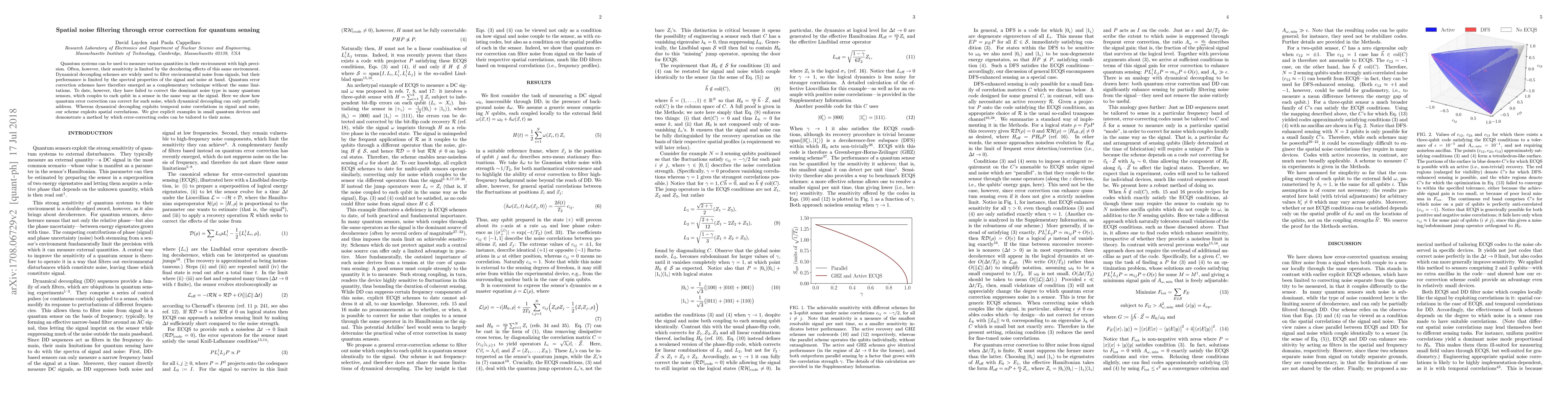 This paper proposes a quantum error correction technique to filter spatial noise in quantum sensing, addressing limitations of dynamical decoupling. The method leverages spatial noise correlations, offering a tailored approach to enhance precision in quantum measurements.