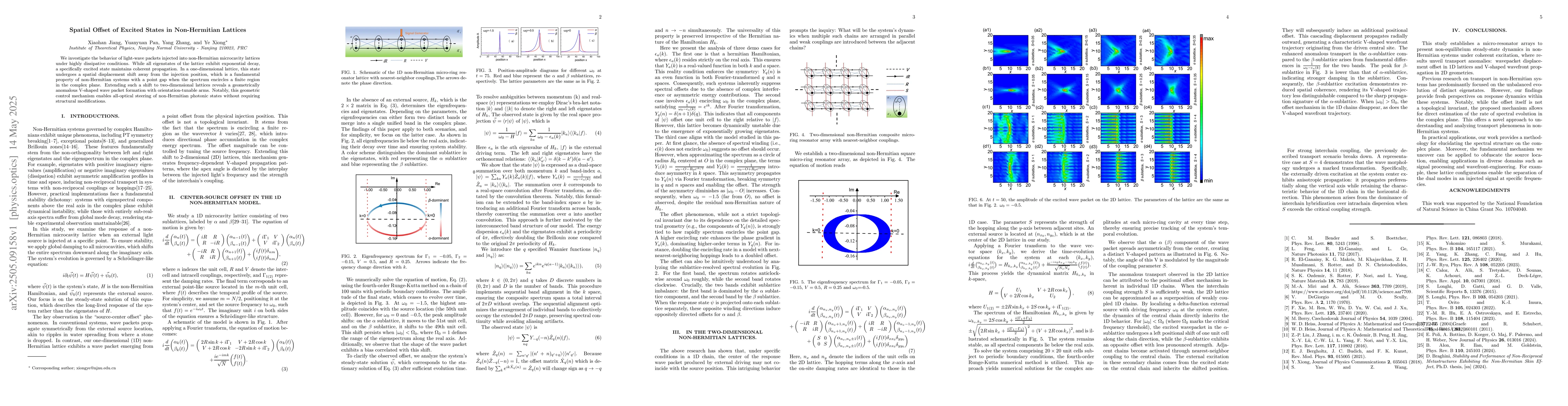 This work distinguishes itself by identifying a spatial offset in excited states and geometric control of wave packets in non-Hermitian systems, which wasn't previously reported in two-dimensional lattices.