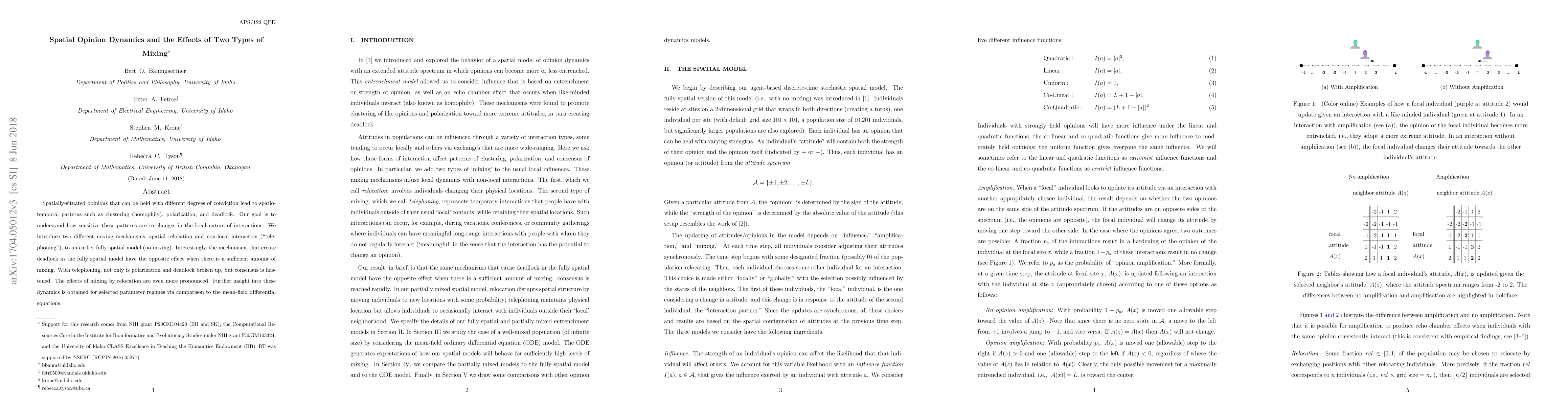 Spatially-situated opinions that can be held with different degrees of conviction lead to spatio-temporal patterns such as clustering (homophily), polarization, and deadlock. Our goal is to understand how sensitive these patterns are to changes in the local nature of interactions. We introduce two different mixing mechanisms, spatial relocation and non-local interaction ("telephoning"), to an earlier fully spatial model (no mixing). Interestingly, the mechanisms that create deadlock in the fully spatial model have the opposite effect when there is a sufficient amount of mixing. With telephoning, not only is polarization and deadlock broken up, but consensus is hastened. The effects of mixing by relocation are even more pronounced. Further insight into these dynamics is obtained for selected parameter regimes via comparison to the mean-field differential equations.