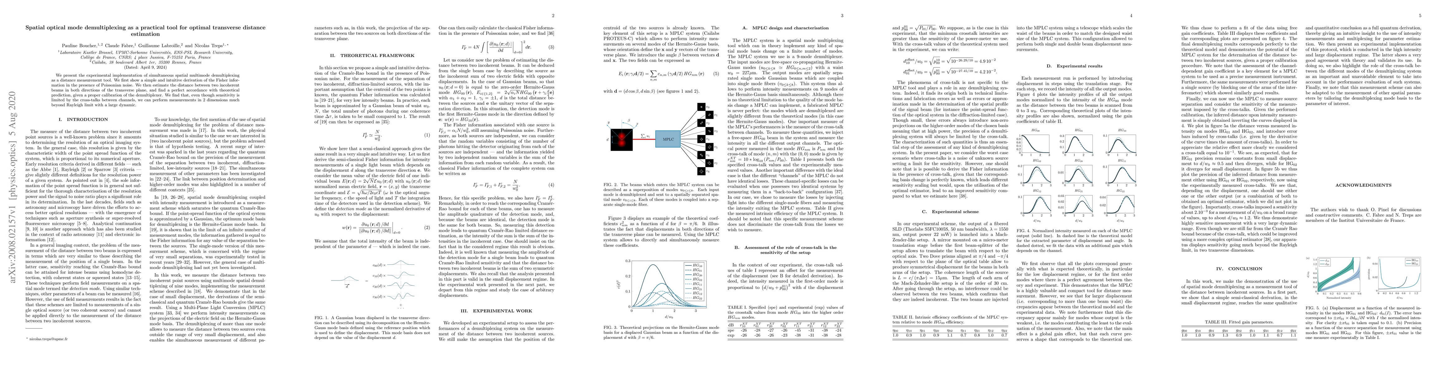 We present the experimental implementation of simultaneous spatial multimode demultiplexing as a distance measurement tool. We first show a simple and intuitive derivation of the Fisher information in the presence of Poissonian noise. We then estimate the distance between two incoherent beams in both directions of the transverse plane, and find a perfect accordance with theoretical prediction, given a proper calibration of the demultiplexer. We find that, even though sensitivity is limited by the cross-talks between channels, we can perform measurements in 2 dimensions much beyond Rayleigh limit with a large dynamic.