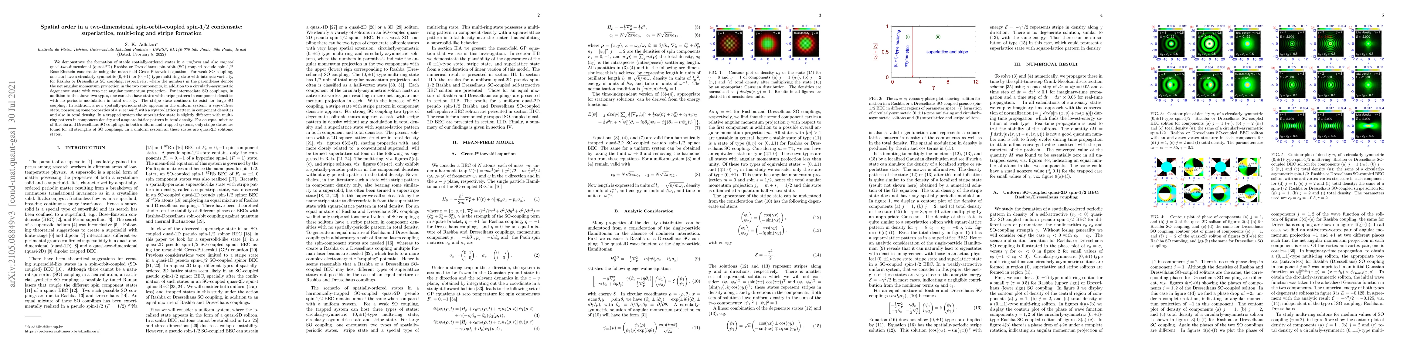 This research demonstrates the formation of stable spatially-ordered states in a uniform and trapped quasi-2D spin-orbit coupled Bose-Einstein condensate, revealing multi-ring, stripe, and superlattice patterns, with implications for understanding exotic quantum phases.