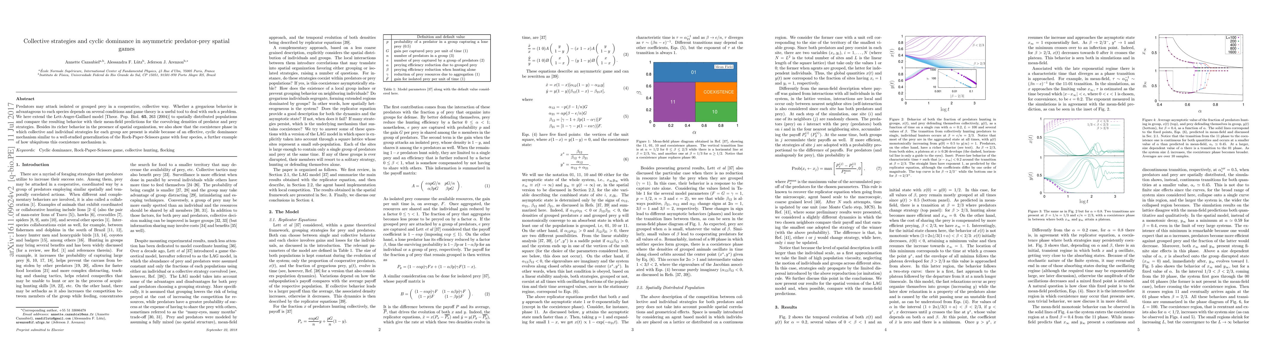 Predators may attack isolated or grouped prey in a cooperative, collective way. Whether a gregarious behavior is advantageous to each species depends on several conditions and game theory is a useful tool to deal with such a problem. We here extend the Lett-Auger-Gaillard model [Theor. Pop. Biol. 65 (2004) 263] to spatially distributed populations and compare the resulting behavior with their mean-field predictions for the coevolving densities of predator and prey strategies. Besides its richer behavior in the presence of spatial organization, we also show that the coexistence phase in which collective and individual strategies for each group are present is stable because of an effective, cyclic dominance mechanism similar to a well-studied generalization of the Rock-Paper-Scissors game with four species, a further example of how ubiquitous this coexistence mechanism is.