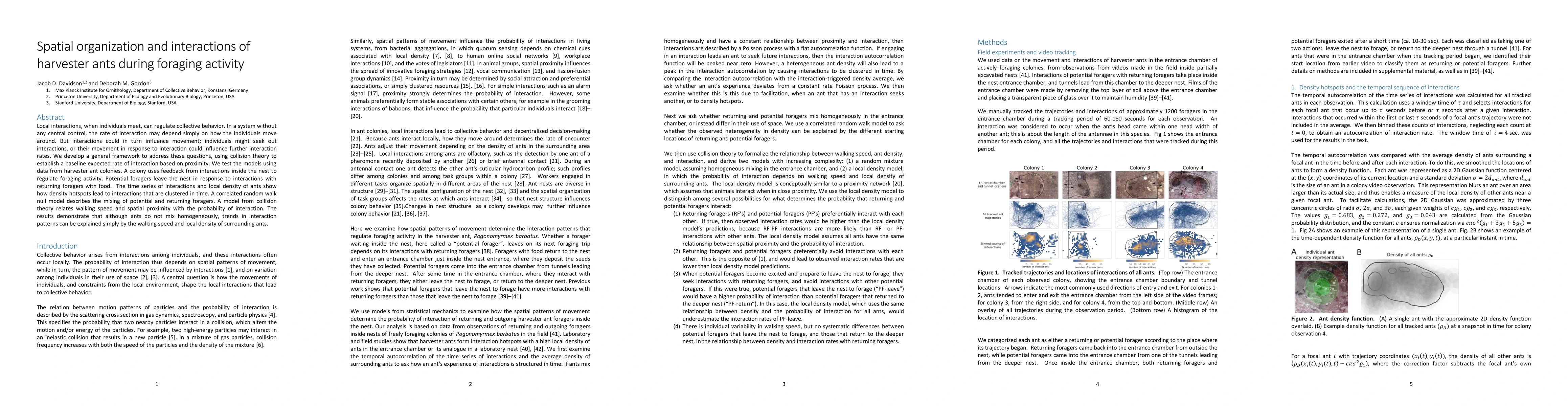 This paper develops a framework to understand how local interactions among harvester ants regulate foraging activity, showing that interaction rates are influenced by walking speed and local density, rather than central control. The study uses collision theory to predict interaction rates based on spatial proximity and validates the model with empirical data from ant colonies.