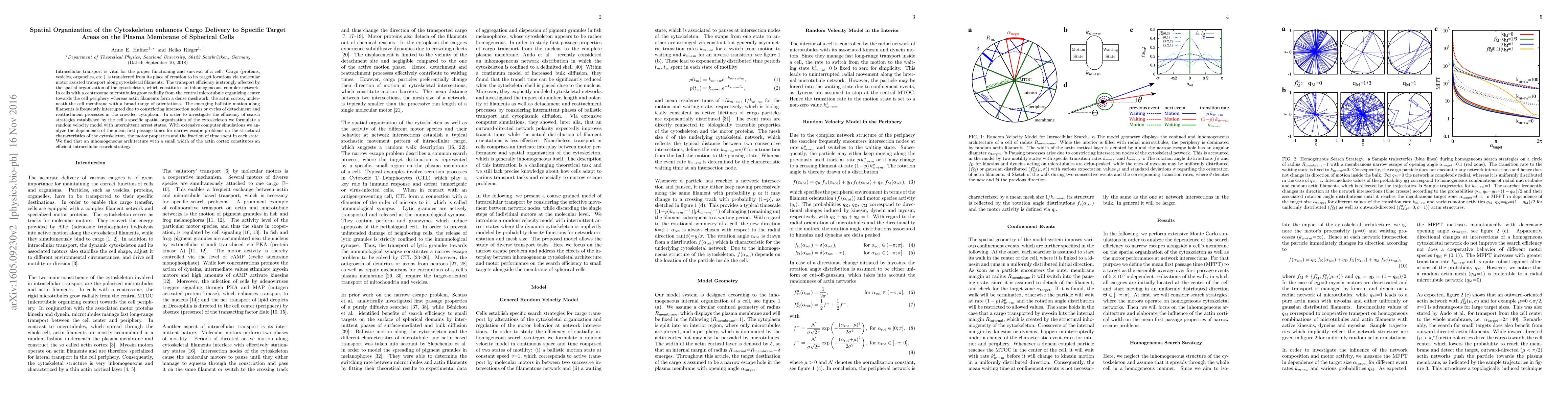 This paper investigates how the spatial organization of the cytoskeleton affects the efficiency of cargo transport in spherical cells. Through simulations, it finds that an inhomogeneous cytoskeleton with a narrow actin cortex enhances the delivery of cargo to specific membrane targets.