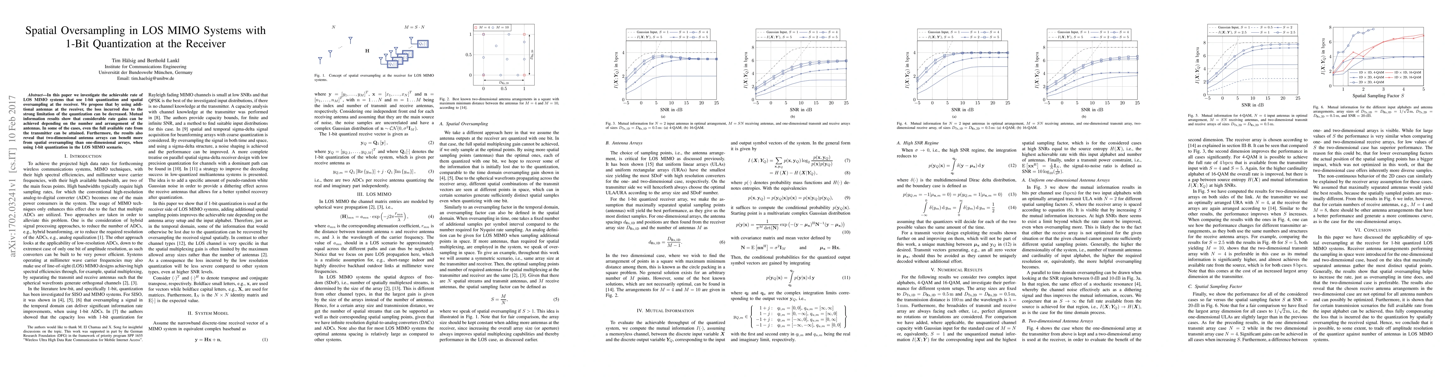 This paper explores the achievable rate in Line-of-Sight (LOS) MIMO systems employing 1-bit quantization and spatial oversampling at the receiver. It suggests that additional receiver antennas can mitigate the rate loss due to quantization limitations, achieving significant rate gains, especially with two-dimensional antenna arrays.