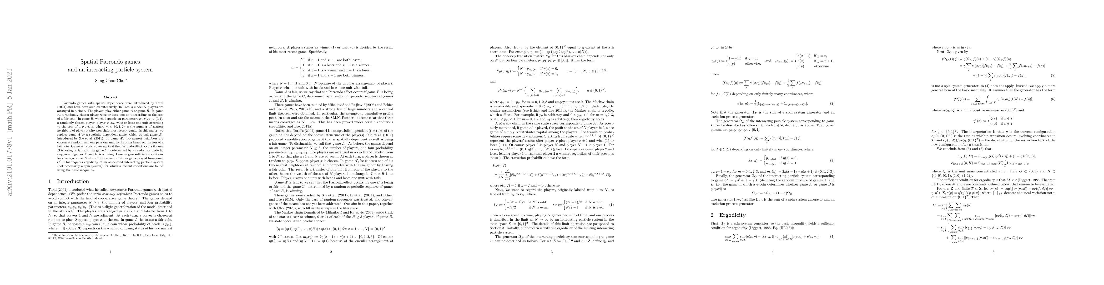 Parrondo games with spatial dependence were introduced by Toral (2001) and have been studied extensively. In Toral's model $N$ players are arranged in a circle. The players play either game $A$ or game $B$. In game $A$, a randomly chosen player wins or loses one unit according to the toss of a fair coin. In game $B$, which depends on parameters $p_0,p_1,p_2\in[0,1]$, a randomly chosen player, player $x$ say, wins or loses one unit according to the toss of a $p_m$-coin, where $m\in\{0,1,2\}$ is the number of nearest neighbors of player $x$ who won their most recent game. In this paper, we replace game $A$ by a spatially dependent game, which we call game $A'$, introduced by Xie et al.~(2011). In game $A'$, two nearest neighbors are chosen at random, and one pays one unit to the other based on the toss of a fair coin. Game $A'$ is fair, so we say that the Parrondo effect occurs if game $B$ is losing or fair and the game $C'$, determined by a random or periodic sequence of games $A'$ and $B$, is winning. Here we give sufficient conditions for convergence as $N\to\infty$ of the mean profit per game played from game $C'$. This requires ergodicity of an associated interacting particle system (not necessarily a spin system), for which sufficient conditions are found using the basic inequality.