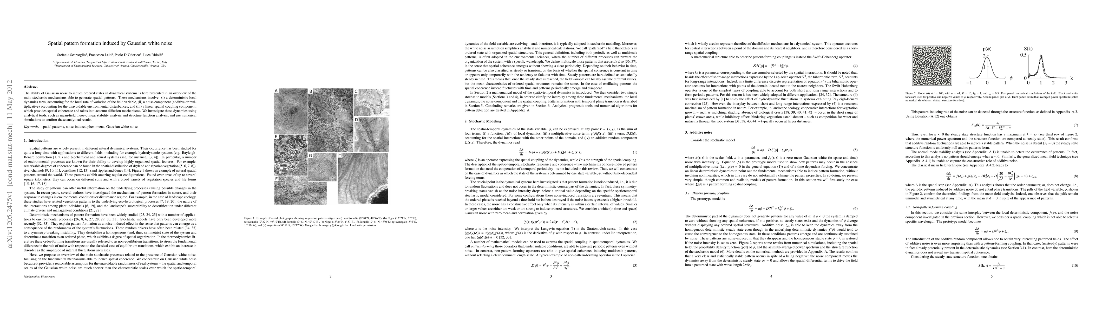 The ability of Gaussian noise to induce ordered states in dynamical systems is here presented in an overview of the main stochastic mechanisms able to generate spatial patterns. These mechanisms involve: (i) a deterministic local dynamics term, accounting for the local rate of variation of the field variable, (ii) a noise component (additive or multiplicative) accounting for the unavoidable environmental disturbances, and (iii) a linear spatial coupling component, which provides spatial coherence and takes into account diffusion mechanisms. We investigate these dynamics using analytical tools, such as mean-field theory, linear stability analysis and structure function analysis, and use numerical simulations to confirm these analytical results.