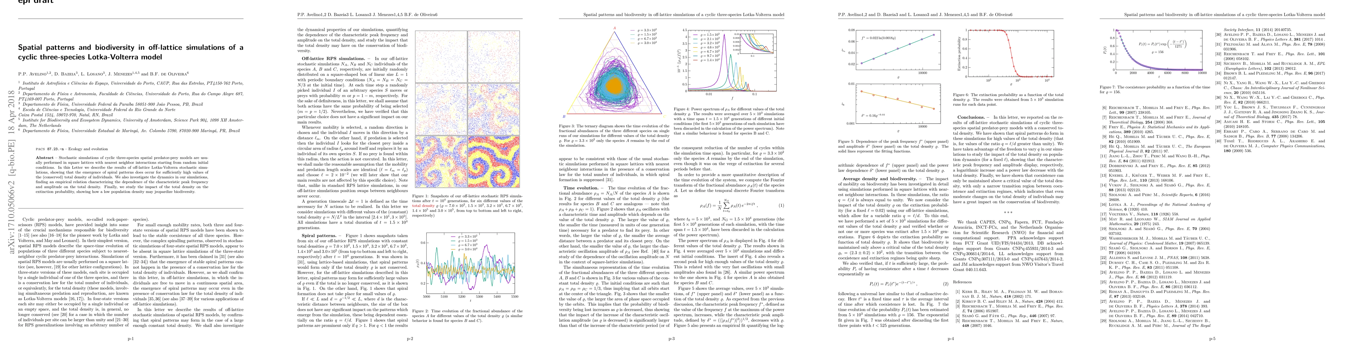 This paper explores off-lattice stochastic simulations of a cyclic three-species Lotka-Volterra model, revealing the emergence of spiral patterns at high total densities and an empirical relation between the density and dynamics. It also finds that low population density increases extinction probability, threatening biodiversity.