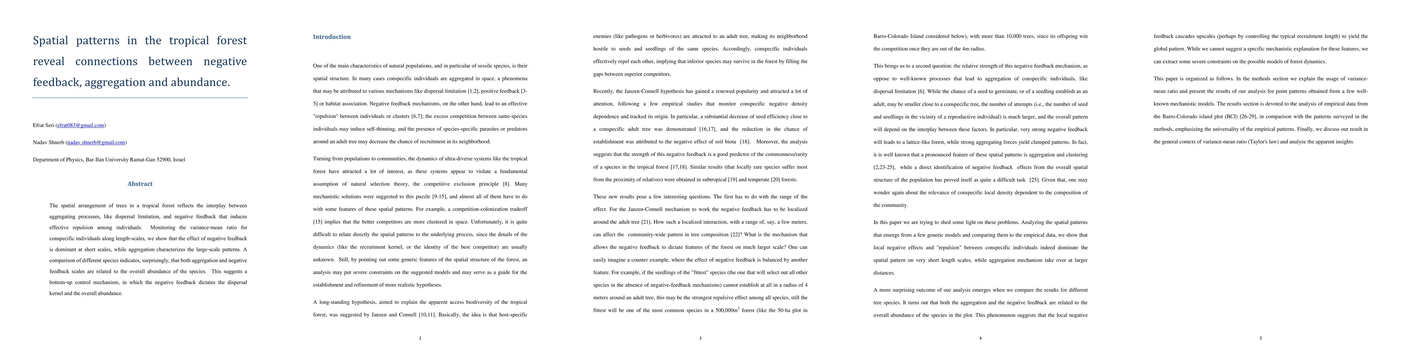 The spatial arrangement of trees in a tropical forest reflects the interplay between aggregating processes, like dispersal limitation, and negative feedback that induces effective repulsion among individuals. Monitoring the variance-mean ratio for conspecific individuals along length-scales, we show that the effect of negative feedback is dominant at short scales, while aggregation characterizes the large-scale patterns. A comparison of different species indicates, surprisingly, that both aggregation and negative feedback scales are related to the overall abundance of the species. This suggests a bottom-up control mechanism, in which the negative feedback dictates the dispersal kernel and the overall abundance.