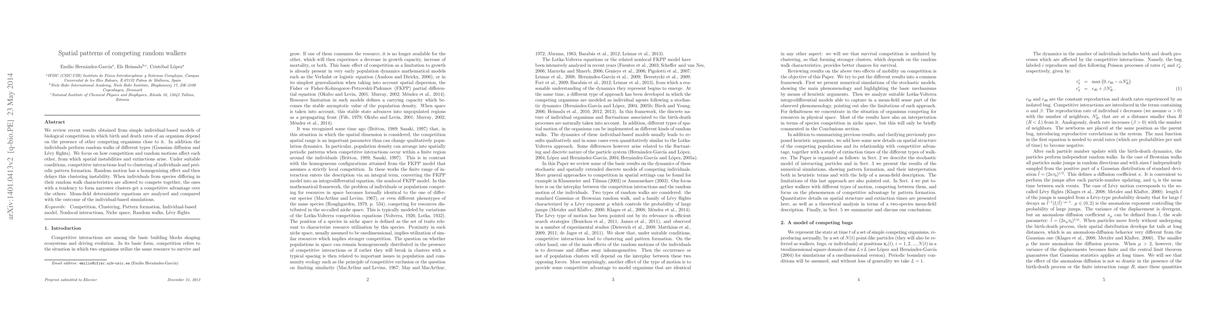 We review recent results obtained from simple individual-based models of biological competition in which birth and death rates of an organism depend on the presence of other competing organisms close to it. In addition the individuals perform random walks of different types (Gaussian diffusion and L\'{e}vy flights). We focus on how competition and random motions affect each other, from which spatial instabilities and extinctions arise. Under suitable conditions, competitive interactions lead to clustering of individuals and periodic pattern formation. Random motion has a homogenizing effect and then delays this clustering instability. When individuals from species differing in their random walk characteristics are allowed to compete together, the ones with a tendency to form narrower clusters get a competitive advantage over the others. Mean-field deterministic equations are analyzed and compared with the outcome of the individual-based simulations.
