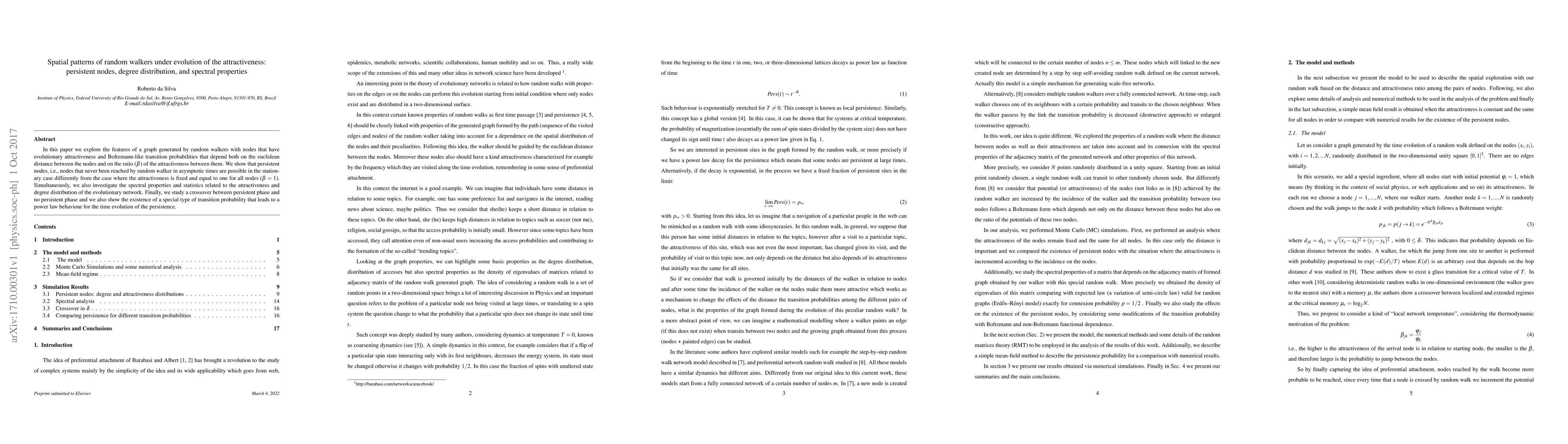 This paper explores how random walkers with evolving node attractiveness create graphs with persistent nodes, varying degree distributions, and unique spectral properties. It also shows a transition between persistent and non-persistent phases and predicts power-law behavior in persistence over time.