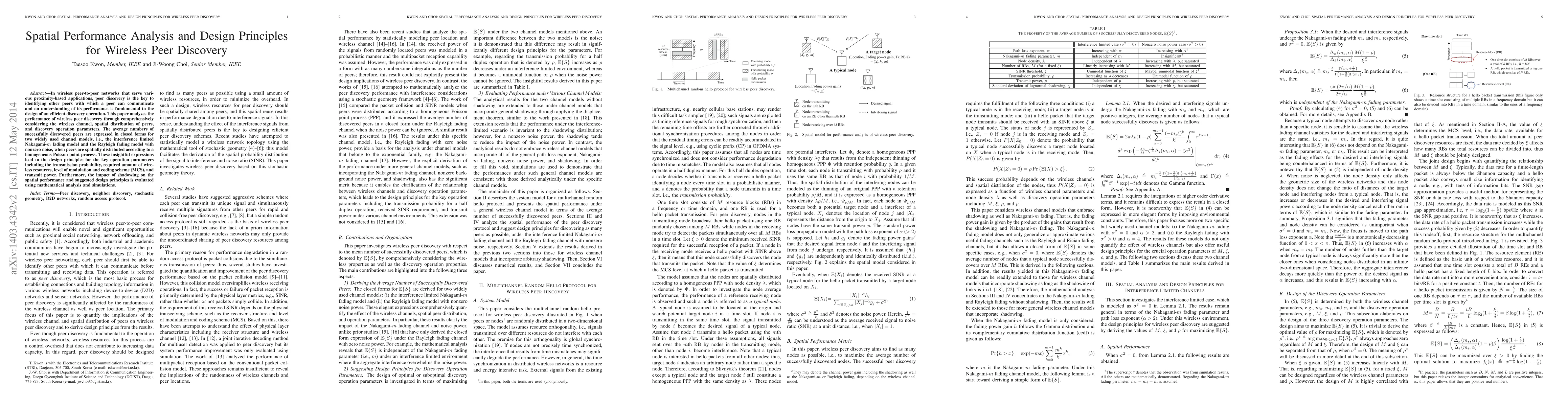 This paper analyzes the performance of wireless peer discovery in peer-to-peer networks, deriving closed-form expressions for the average number of discovered peers under different channel models and spatial distributions. It provides design principles for optimizing discovery operations based on transmission parameters and evaluates the impact of shadowing on performance.
