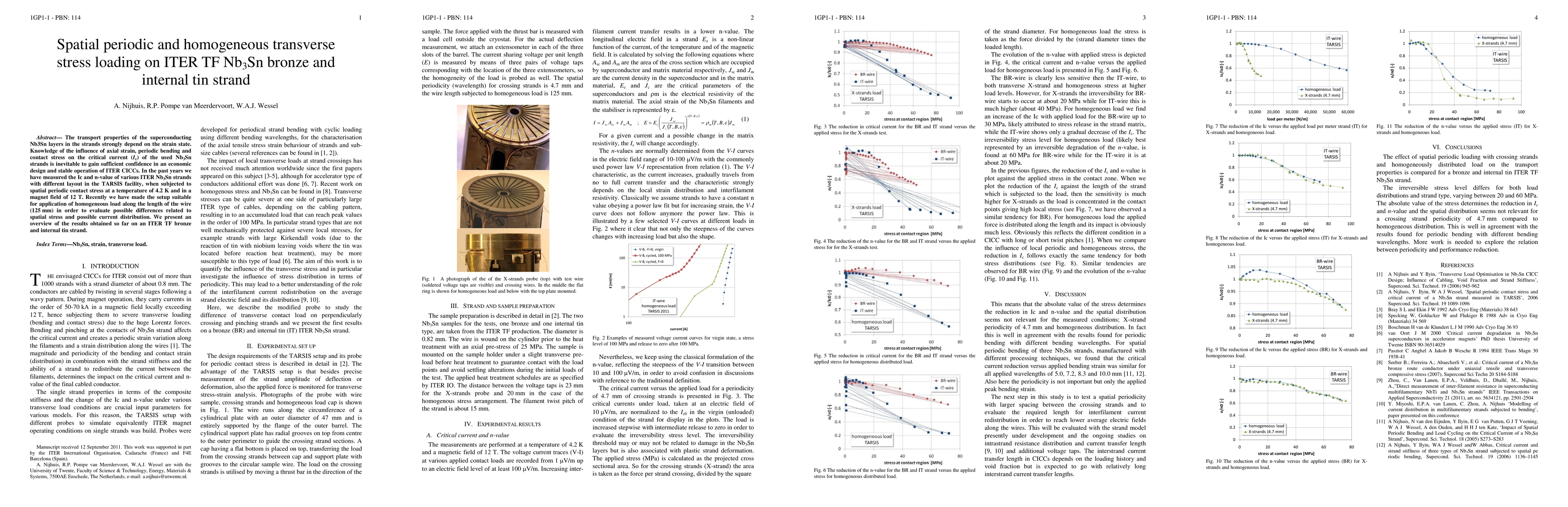 The transport properties of the superconducting Nb3Sn layers in the strands strongly depend on the strain state. Knowledge of the influence of axial strain, periodic bending and contact stress on the critical current (Ic) of the used Nb3Sn strands is inevitable to gain sufficient confidence in an economic design and stable operation of ITER CICCs. In the past years we have measured the Ic and n-value of various ITER Nb3Sn strands with different layout in the TARSIS facility, when subjected to spatial periodic contact stress at a temperature of 4.2 K and in a magnet field of 12 T. Recently we have made the setup suitable for application of homogeneous load along the length of the wire (125 mm) in order to evaluate possible differences related to spatial stress and possible current distribution. We present an overview of the results obtained so far on an ITER TF bronze and internal tin strand.