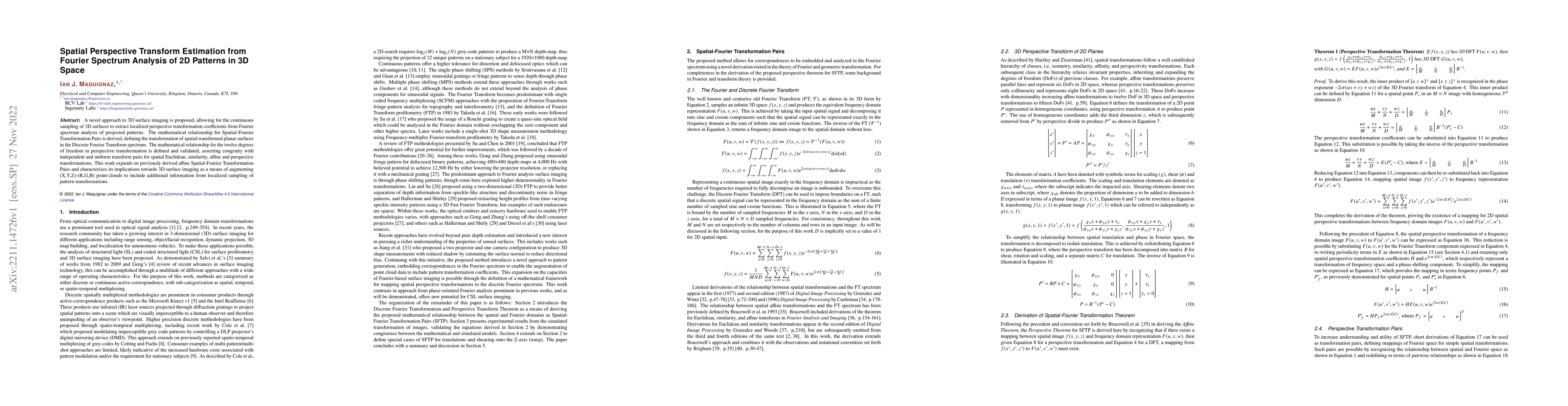 A novel approach to 3D surface imaging is proposed, allowing for the continuous sampling of 3D surfaces to extract localized perspective transformation coefficients from Fourier spectrum analysis of projected patterns. The mathematical relationship for Spatial-Fourier Transformation Pairs is derived, defining the transformation of spatial transformed planar surfaces in the Discrete Fourier Transform spectrum. The mathematical relationship for the twelve degrees of freedom in perspective transformation is defined and validated, asserting congruity with independent and uniform transform pairs for spatial Euclidean, similarity, affine and perspective transformations. This work expands on previously derived affine Spatial-Fourier Transformation Pairs and characterizes its implications towards 3D surface imaging as a means of augmenting (X,Y,Z)-(R,G,B) point-clouds to include additional information from localized sampling of pattern transformations.
