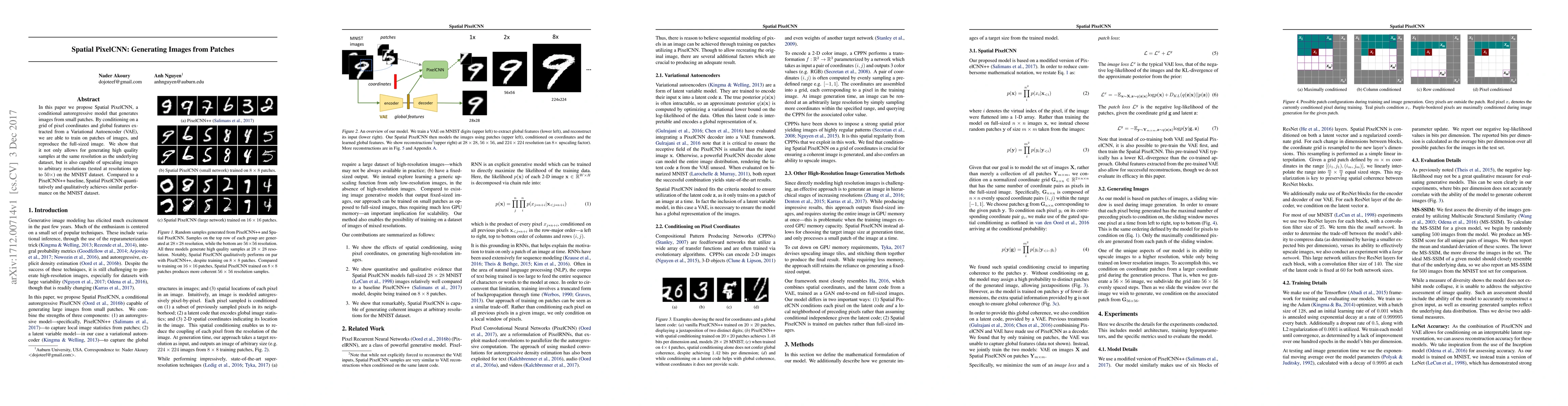 Spatial PixelCNN is a conditional autoregressive model that generates images from small patches, conditioned on pixel coordinates and global features from a VAE. It can upscale images to higher resolutions while maintaining high quality, comparable to PixelCNN++ on the MNIST dataset.